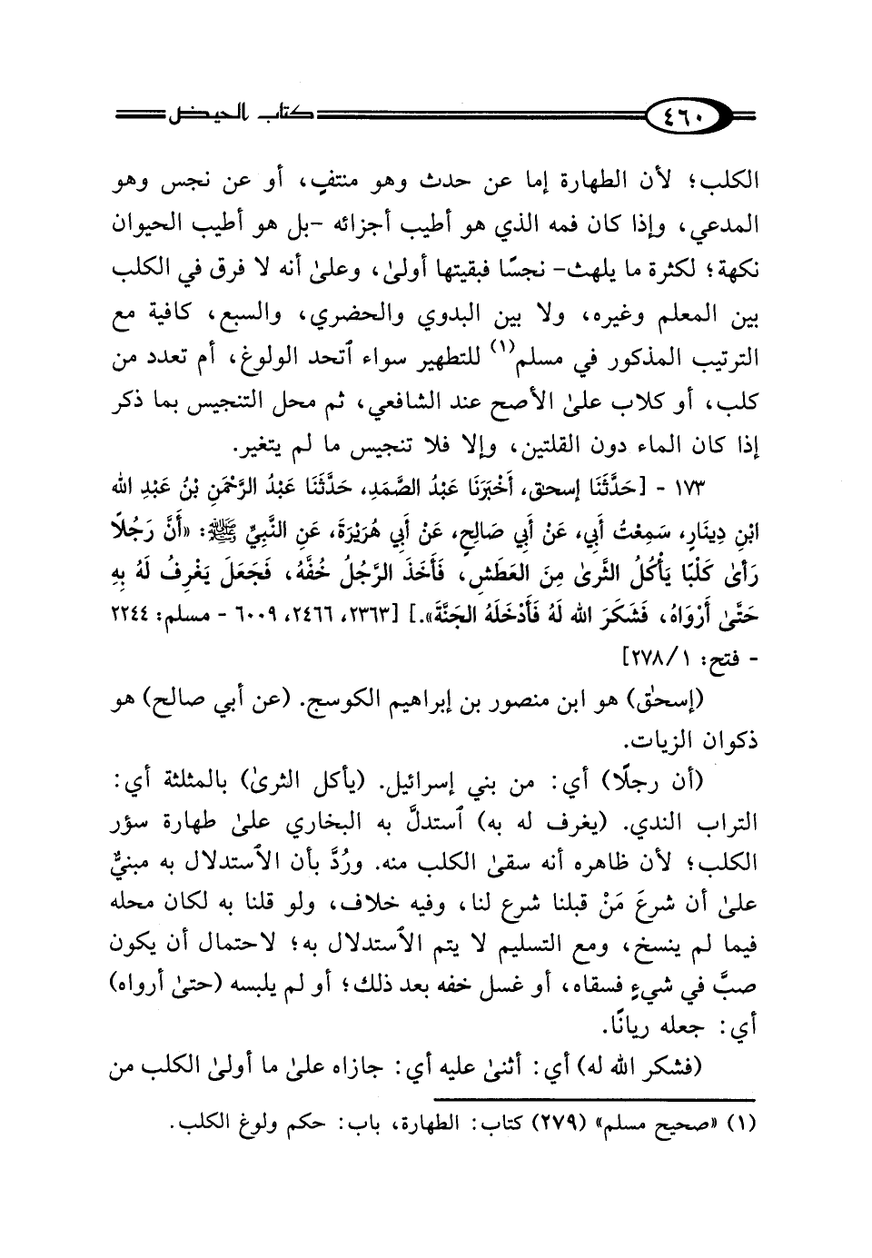 173 - [حَدَّثَنَا إِسْحَاقُ، أَخْبَرَنَا عَبْدُ الصَّمَدِ، حَدَّثَنَا عَبْدُ الرَّحْمَنِ بْنُ عَبْدِ اللَّهِ بْنِ دِينَارٍ، سَمِعْتُ أَبِي، عَنْ أَبِي صَالِحٍ، عَنْ أَبِي هُرَيْرَةَ عَنِ النَّبِيِّ صَلَّى اللهُ عَلَيْهِ وَسَلَّمَ: "أَنَّ رَجُلًا رَأَى كَلْبًا يَأْكُلُ الثَّرَى مِنَ العَطَشِ، فَأَخَذَ الرَّجُلُ خُفَّهُ، فَجَعَلَ يَغْرِفُ لَهُ بِهِ حَتَّى أَرْوَاهُ، فَشَكَرَ اللَّهُ لَهُ، فَأَدْخَلَهُ الجَنَّةَ".] [2363، 2466، 6009 - مسلم: 2244 - فتح: 1/ 278]