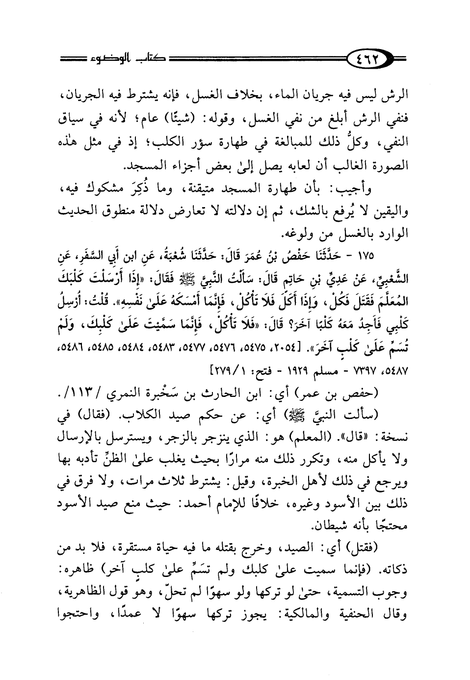 175 - حَدَّثَنَا حَفْصُ بْنُ عُمَرَ، قَالَ: حَدَّثَنَا شُعْبَةُ، عَنِ ابْنِ أَبِي السَّفَرِ، عَنِ الشَّعْبِيِّ، عَنْ عَدِيِّ بْنِ حَاتِمٍ، قَالَ: سَأَلْتُ النَّبِيَّ صَلَّى اللهُ عَلَيْهِ وَسَلَّمَ فَقَالَ: "إِذَا أَرْسَلْتَ كَلْبَكَ المُعَلَّمَ فَقَتَلَ فَكُلْ، وَإِذَا أَكَلَ فَلَا تَأْكُلْ، فَإِنَّمَا أَمْسَكَهُ عَلَى نَفْسِهِ" قُلْتُ: أُرْسِلُ كَلْبِي فَأَجِدُ مَعَهُ كَلْبًا آخَرَ؟ قَالَ: "فَلَا تَأْكُلْ، فَإِنَّمَا سَمَّيْتَ عَلَى كَلْبِكَ وَلَمْ تُسَمِّ عَلَى كَلْبٍ آخَرَ".