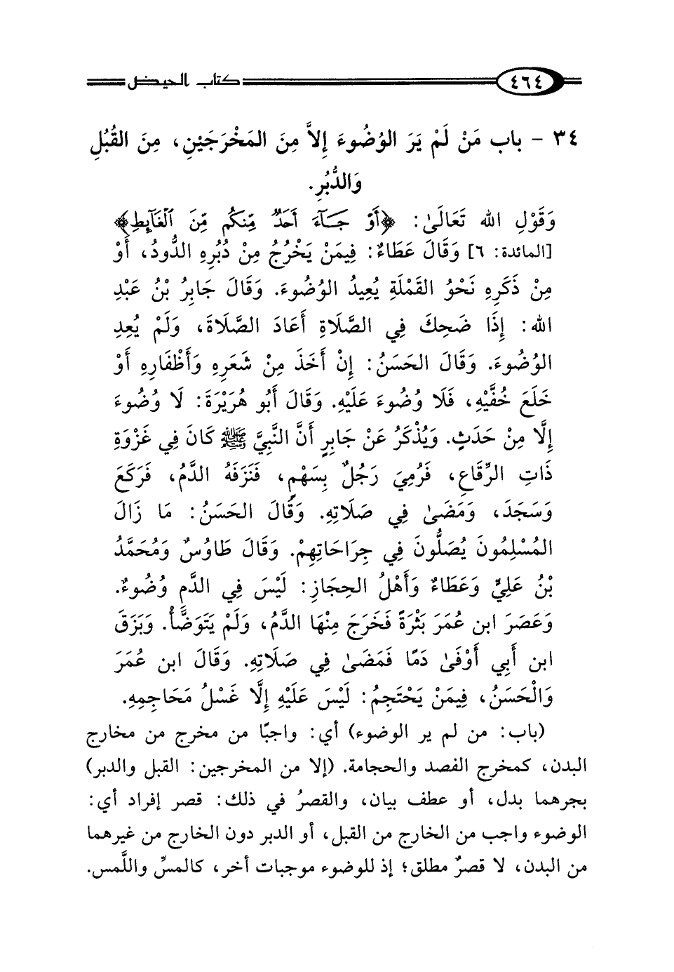 34 - بَابُ مَنْ لَمْ يَرَ الوُضُوءَ إلا مِنَ المَخْرَجَيْنِ: مِنَ القُبُلِ وَالدُّبُرِ.