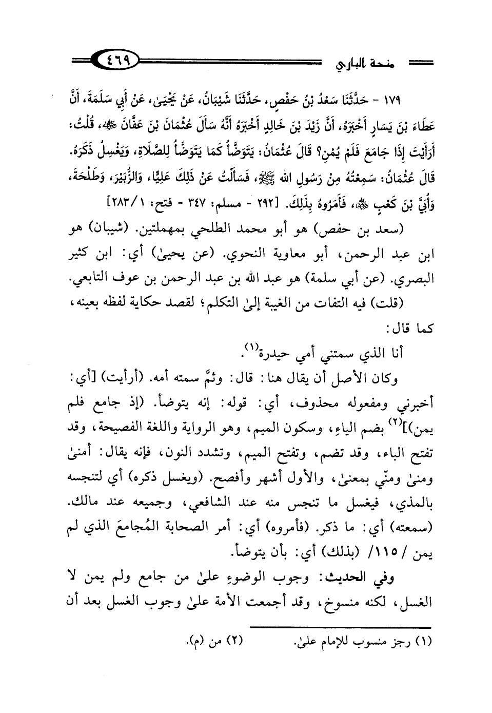 179 - حَدَّثَنَا سَعْدُ بْنُ حَفْصٍ، حَدَّثَنَا شَيْبَانُ، عَنْ يَحْيَى، عَنْ أَبِي سَلَمَةَ، أَنَّ عَطَاءَ بْنَ يَسَارٍ، أَخْبَرَهُ أَنَّ زَيْدَ بْنَ خَالِدٍ، أَخْبَرَهُ أَنَّهُ، سَأَلَ عُثْمَانَ بْنَ عَفَّانَ رَضِيَ اللَّهُ عَنْهُ، قُلْتُ أَرَأَيْتَ إِذَا جَامَعَ فَلَمْ يُمْنِ، قَالَ عُثْمَانُ "يَتَوَضَّأُ كَمَا يَتَوَضَّأُ لِلصَّلاةِ وَيَغْسِلُ ذَكَرَهُ" قَالَ عُثْمَانُ سَمِعْتُهُ مِنْ رَسُولِ اللَّهِ صَلَّى اللهُ عَلَيْهِ وَسَلَّمَ فَسَأَلْتُ عَنْ ذَلِكَ عَلِيًّا، وَالزُّبَيْرَ، وَطَلْحَةَ، وَأُبَيَّ بْنَ كَعْبٍ رَضِيَ اللَّهُ عَنْهُمْ فَأَمَرُوهُ بِذَلِكَ.