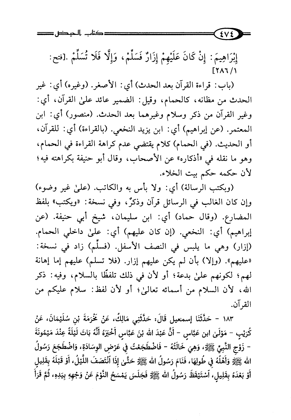 (وبكتب الرسالة) أي: ولا بأس به والكاتب. (على غير وضوء) وإن كان الغالب في الرسائل قرآن وذكرٌ، وفي نسخة: "ويكتب" بلفظ المضارع. (وقال حماد) أي: ابن سليمان، شيخ أبي حنيفة. (عن إبراهيم) أي: النخعي. (إن كان عليهم) أي: على داخلي الحمام. (إزار) وهي ما يلبس في النصف الأسفل. (فسلِّم) زاد في نسخة: "عليهم". (وإلا) بأن لم يكن عليهم إزار. (فلا تسلم) عليهم إما إهانة لهم؛ لكونهم على بدعة؛ أو لأن في ذلك تلفظًا بالسلام، وفيه: ذكر الله، لأن السلام من أسمائه تعالى؛ أو لأن لفظ: سلام عليكم من القرآن.