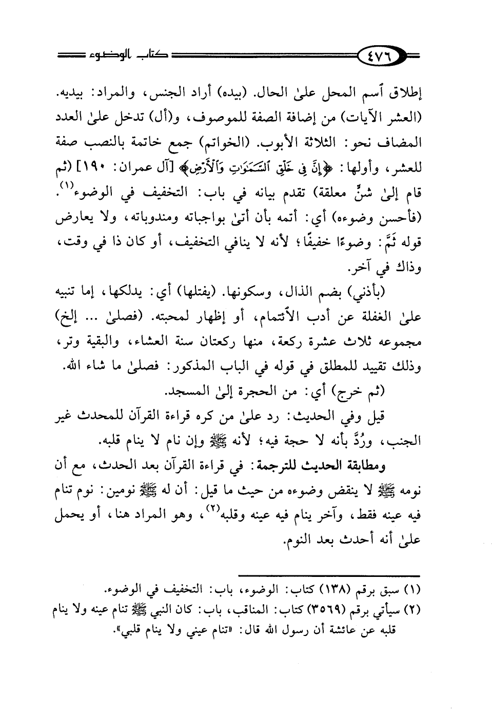 إطلاق اسم المحل على الحال. (بيده) أراد الجنس، والمراد: بيديه. (العشر الآيات) من إضافة الصفة للموصوف، و (أل) تدخل على العدد المضاف نحو: الثلاثة الأبوب. (الخواتم) جمع خاتمة بالنصب صفة للعشر، وأولها: {إِنَّ فِي خَلْقِ السَّمَاوَاتِ وَالْأَرْضِ} [آل عمران: 190] (ثم قام إلى شنٍّ معلقة) تقدم بيانه في باب: التخفيف في الوضوء (¬1). (فأحسن وضوءه) أي: أتمه بأن أتى بواجباته ومندوباته، ولا يعارض قوله ثَمَّ: وضوءًا خفيفًا؛ لأنه لا ينافي التخفيف، أو كان ذا في وقت، وذاك في آخر.
