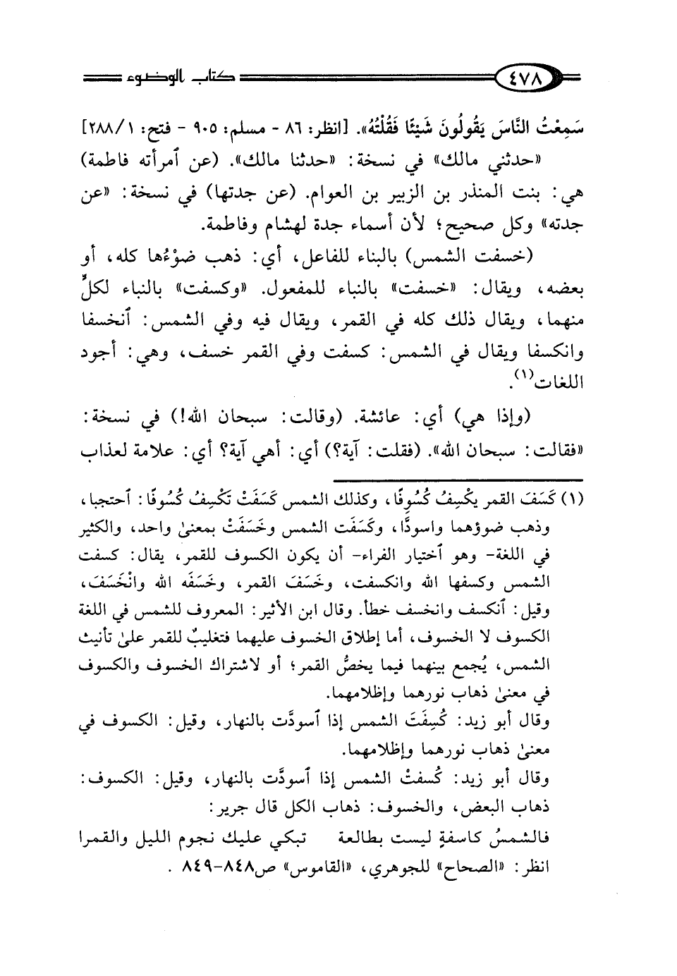 (خسفت الشمس) بالبناء للفاعل، أي: ذهب ضوْءُها كله، أو بعضه، ويقال: "خسفت" بالنباء للمفعول. "وكسفت" بالنباء لكلٍّ منهما، ويقال ذلك كله في القمر، ويقال فيه وفي الشمس: انخسفا وانكسفا ويقال في الشمس: كسفت وفي القمر خسف، وهي: أجود اللغات (¬1).