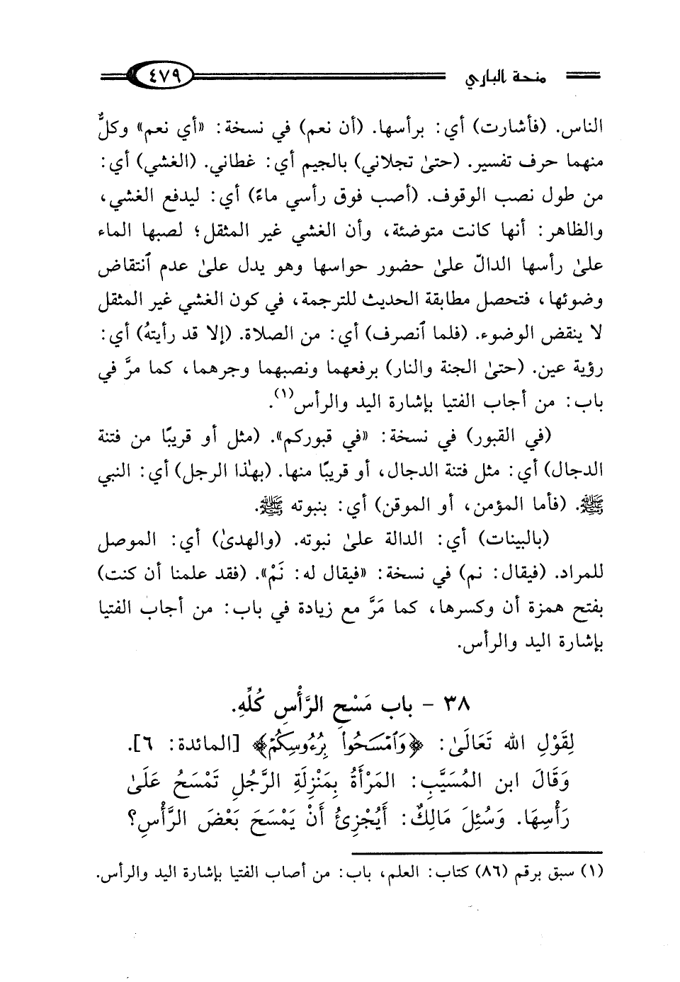الناس. (فأشارت) أي: برأسها. (أن نعم) في نسخة: "أي نعم" وكلٌّ منهما حرف تفسير. (حتى تجلاني) بالجيم أي: غطاني. (الغشي) أي: من طول نصب الوقوف. (أصب فوق رأسي ماءً) أي: ليدفع الغشي، والظاهر: أنها كانت متوضئة، وأن الغشي غير المثقل؛ لصبها الماء على رأسها الدالّ على حضور حواسها وهو يدل على عدم انتقاض وضوئها، فتحصل مطابقة الحديث للترجمة، في كون الغشي غير المثقل لا ينقض الوضوء. (فلما انصرف) أي: من الصلاة. (إلا قد رأيتهُ) أي: رؤية عين. (حتى الجنة والنار) برفعهما ونصبهما وجرهما، كما مرَّ في باب: من أجاب الفتيا بإشارة اليد والرأس (¬1).