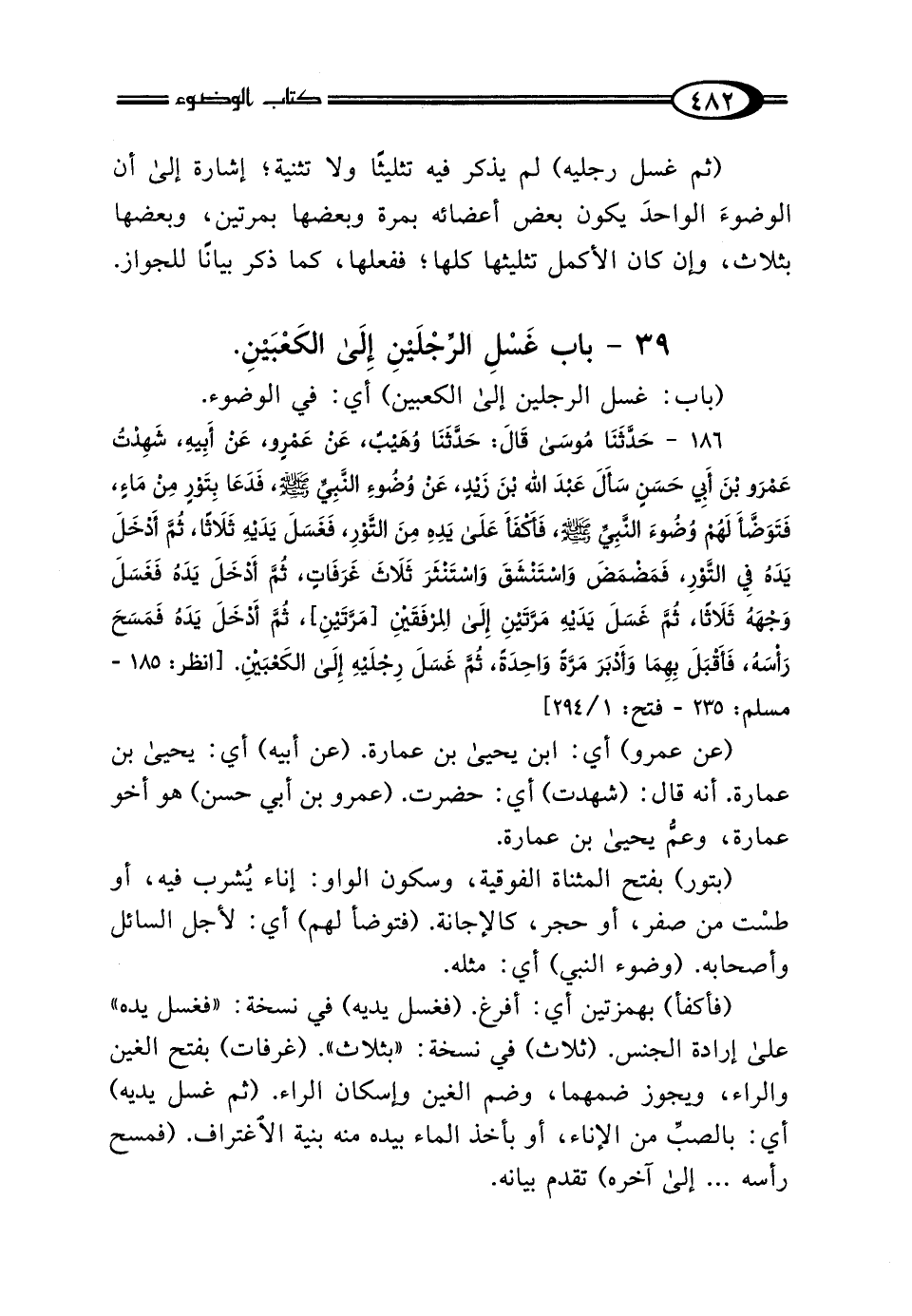 186 - حَدَّثَنَا مُوسَى، قَالَ: حَدَّثَنَا وُهَيْبٌ، عَنْ عَمْرٍو، عَنْ أَبِيهِ، شَهِدْتُ عَمْرَو بْنَ أَبِي حَسَنٍ، سَأَلَ عَبْدَ اللَّهِ بْنَ زَيْدٍ، عَنْ وُضُوءِ النَّبِيِّ صَلَّى اللهُ عَلَيْهِ وَسَلَّمَ فَدَعَا بِتَوْرٍ مِنْ مَاءٍ، فَتَوَضَّأَ لَهُمْ وُضُوءَ النَّبِيِّ صَلَّى اللهُ عَلَيْهِ وَسَلَّمَ، "فَأَكْفَأَ عَلَى يَدِهِ مِنَ التَّوْرِ، فَغَسَلَ يَدَيْهِ ثَلاثًا، ثُمَّ أَدْخَلَ يَدَهُ فِي التَّوْرِ، فَمَضْمَضَ وَاسْتَنْشَقَ وَاسْتَنْثَرَ، ثَلاثَ غَرَفَاتٍ، ثُمَّ أَدْخَلَ يَدَهُ فَغَسَلَ وَجْهَهُ ثَلاثًا، ثُمَّ غَسَلَ يَدَيْهِ مَرَّتَيْنِ إِلَى المِرْفَقَيْنِ، ثُمَّ أَدْخَلَ يَدَهُ فَمَسَحَ رَأْسَهُ، فَأَقْبَلَ بِهِمَا وَأَدْبَرَ مَرَّةً وَاحِدَةً، ثُمَّ غَسَلَ رِجْلَيْهِ إِلَى الكَعْبَيْنِ".