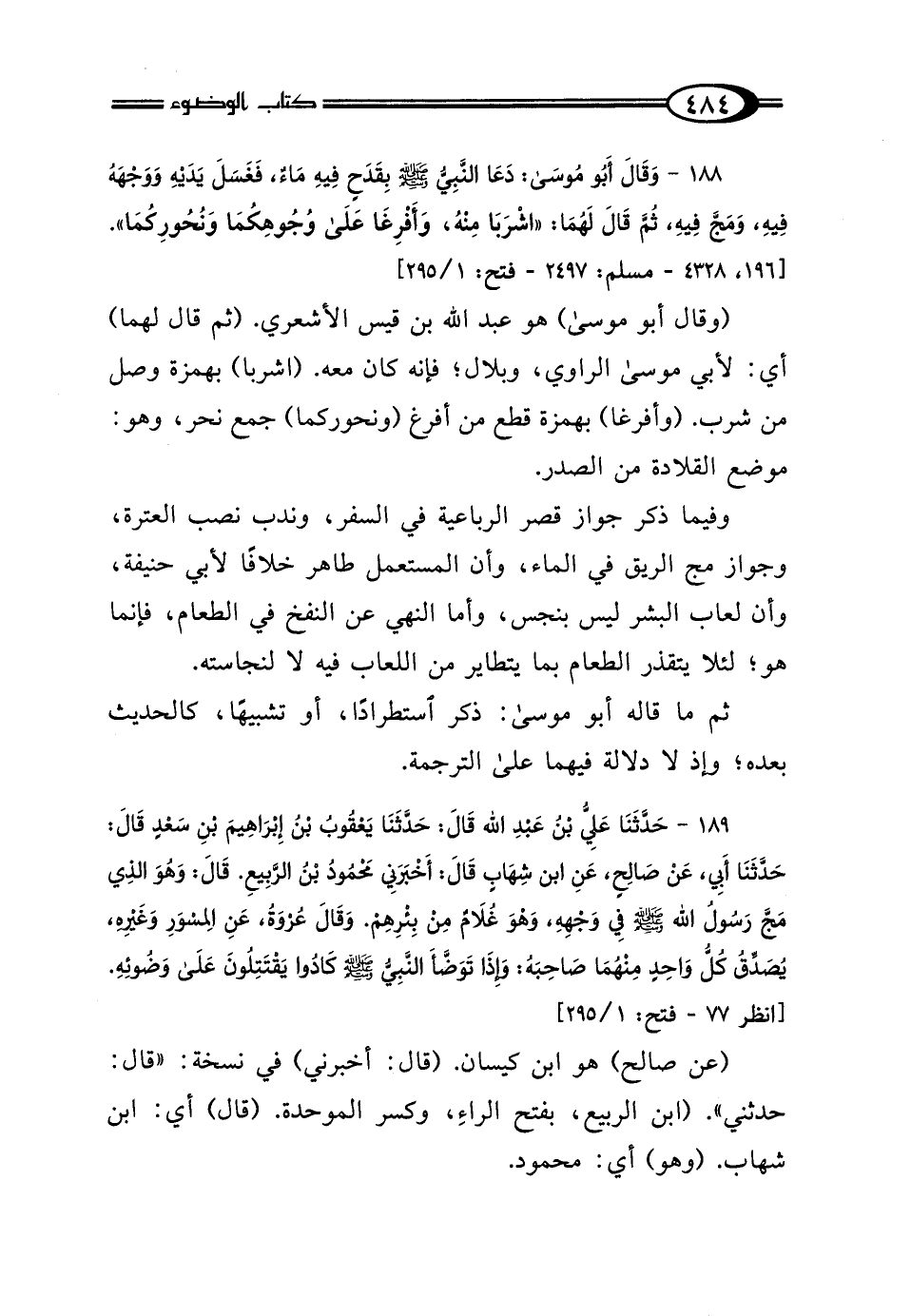 188 - وَقَالَ أَبُو مُوسَى: دَعَا النَّبِيُّ صَلَّى اللهُ عَلَيْهِ وَسَلَّمَ بِقَدَحٍ فِيهِ مَاءٌ، فَغَسَلَ يَدَيْهِ وَوَجْهَهُ فِيهِ، وَمَجَّ فِيهِ، ثُمَّ قَالَ لَهُمَا: "اشْرَبَا مِنْهُ، وَأَفْرِغَا عَلَى وُجُوهِكُمَا وَنُحُورِكُمَا".