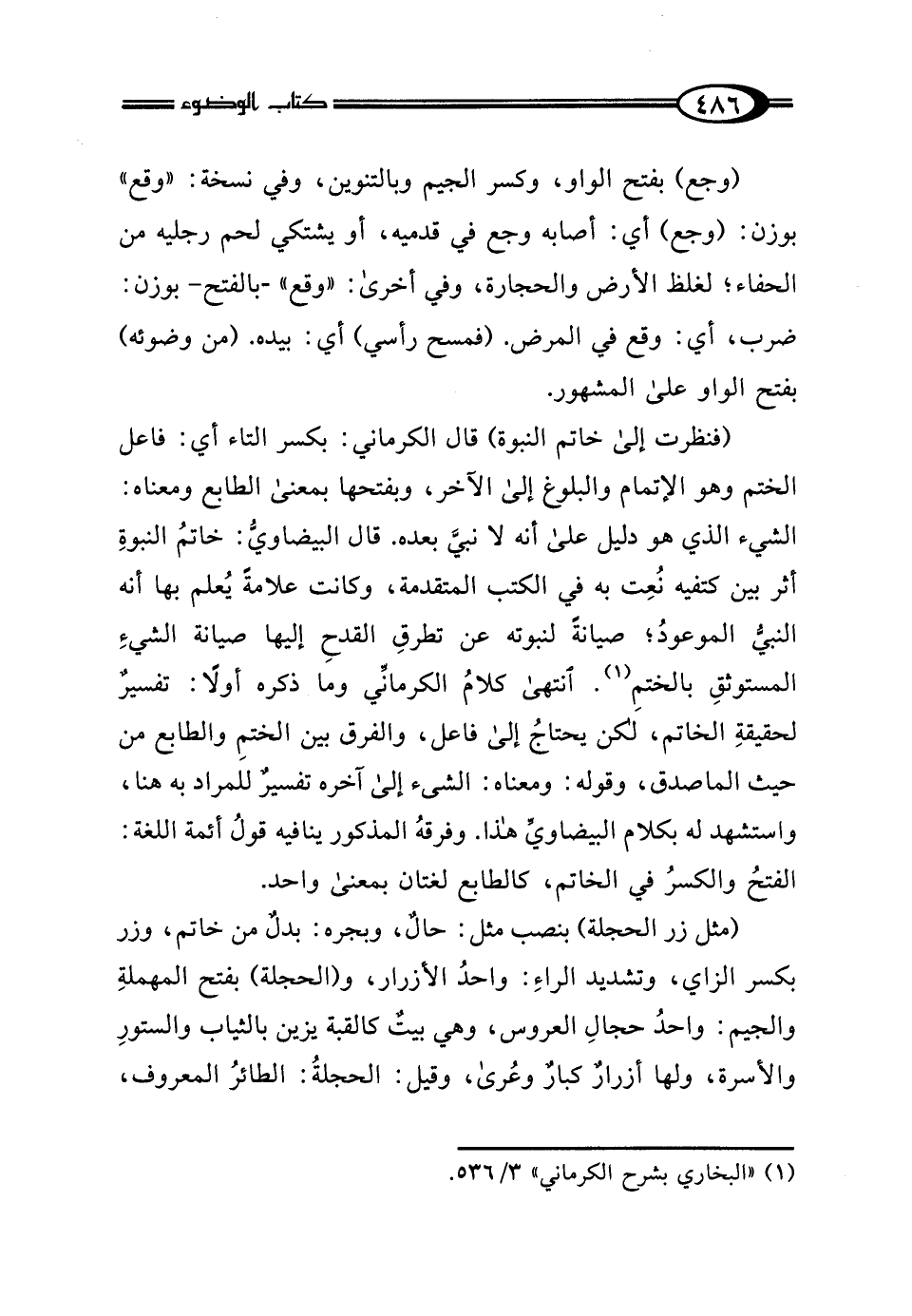 (فنظرت إلى خاتم النبوة) قال الكرماني: بكسر التاء أي: فاعل الختم وهو الإتمام والبلوغ إلى الآخر، وبفتحها بمعنى الطابع ومعناه: الشيء الذي هو دليل على أنه لا نبيَّ بعده. قال البيضاويُّ: خاتمُ النبوةِ أثر بين كتفيه نُعِت به في الكتب المتقدمة، وكانت علامةً يُعلم بها أنه النبيُّ الموعودُ؛ صيانةً لنبوته عن تطرقِ القدحِ إليها صيانة الشيءِ المستوثقِ بالختمِ (¬1). انتهى كلامُ الكرماني وما ذكره أولًا: تفسيرٌ لحقيقةِ الخاتم، لكن يحتاجُ إلى فاعل، والفرق بين الختمِ والطابع من حيث الماصدق، وقوله: ومعناه: الشيء إلى آخره تفسيرٌ للمراد به هنا، واستشهد له بكلام البيضاويِّ هذا. وفرقهُ المذكور ينافيه قولُ أئمة اللغة: الفتحُ والكسرُ في الخاتم، كالطابع لغتان بمعنى واحد.