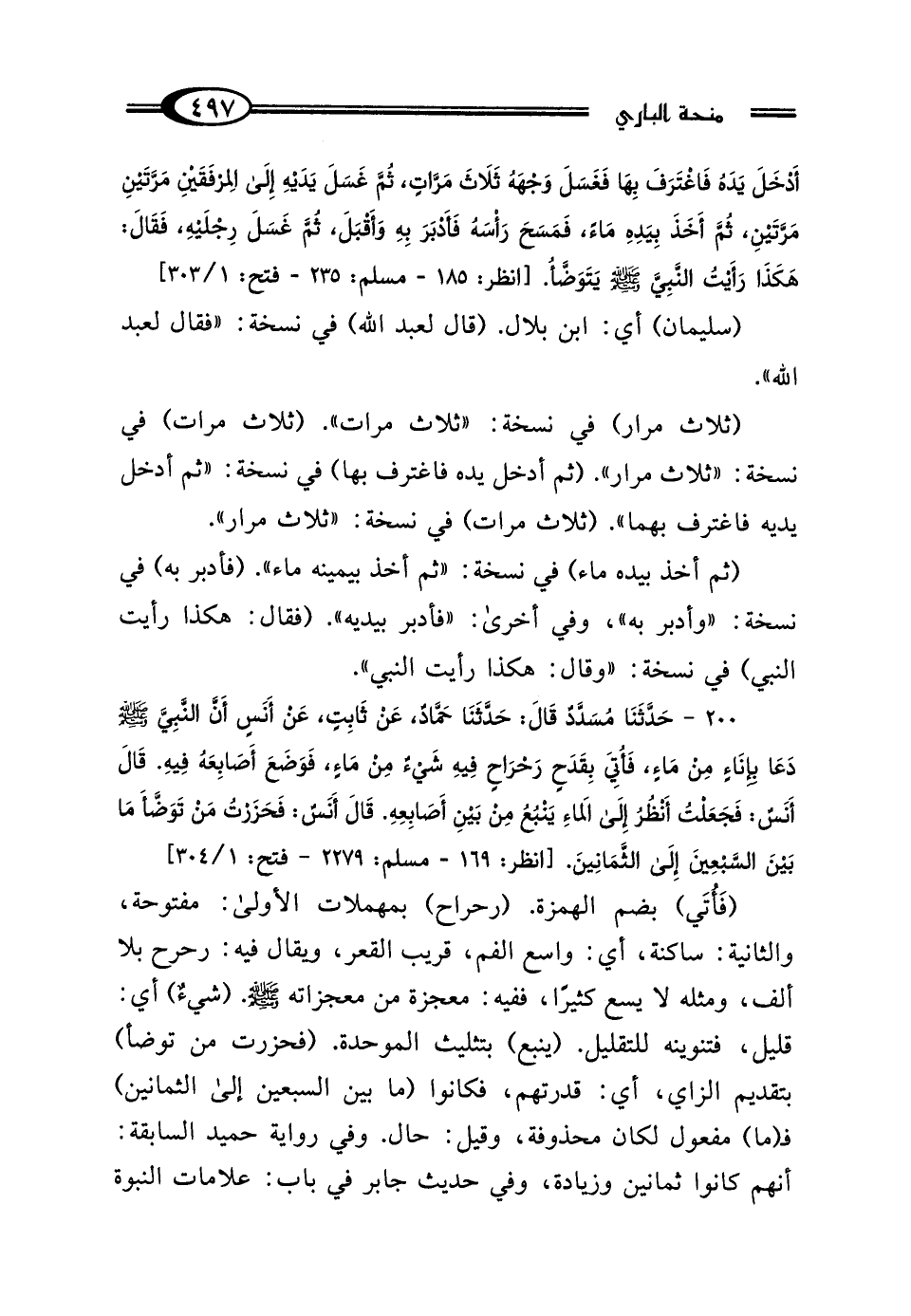 (ثلاث مرار) في نسخة: "ثلاث مرات". (ثلاث مرات) في نسخة: "ثلاث مرار". (ثم أدخل يده فاغترف بها) في نسخة: "ثم أدخل يديه فاغترف بهما". (ثلاث مرات) في نسخة: "ثلاث مرار".