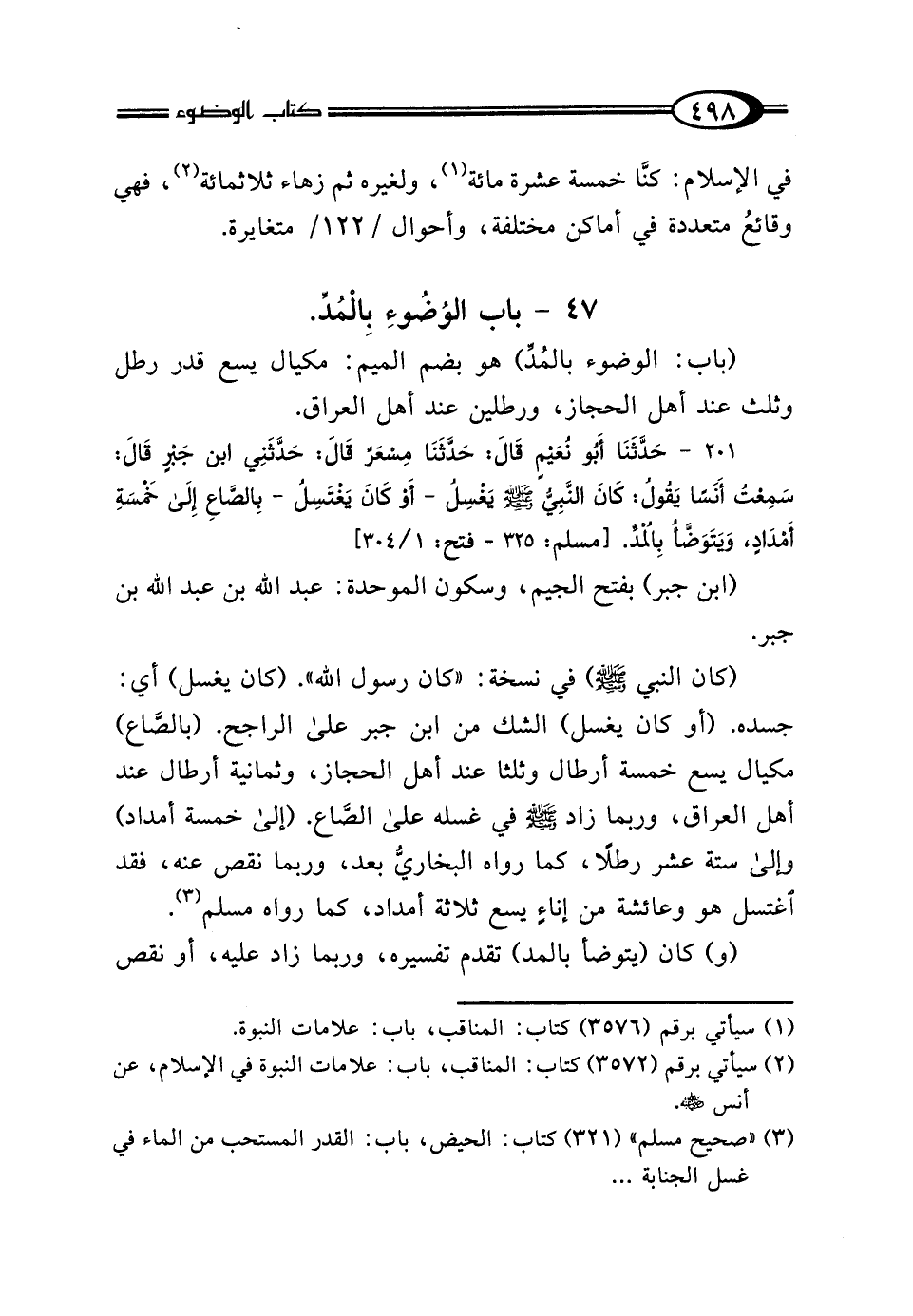 201 - حَدَّثَنَا أَبُو نُعَيْمٍ، قَالَ: حَدَّثَنَا مِسْعَرٌ، قَالَ: حَدَّثَنِي ابْنُ جَبْرٍ، قَالَ: سَمِعْتُ أَنَسًا، يَقُولُ: "كَانَ النَّبِيُّ صَلَّى اللهُ عَلَيْهِ وَسَلَّمَ يَغْسِلُ، أَوْ كَانَ يَغْتَسِلُ، بِالصَّاعِ إِلَى خَمْسَةِ أَمْدَادٍ، وَيَتَوَضَّأُ بِالْمُدِّ".
