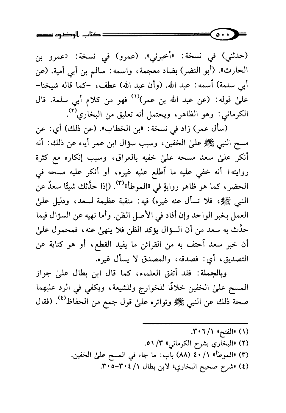وبالجملة: فقد اتفق العلماء، كما قال ابن بطال على جواز المسح على الخفين خلافًا للخوارج وللشيعة، ويكفي في الرد عليهما صحة ذلك عن النبي - صلى الله عليه وسلم - وتواتره على قول جمع من الحفاظ (¬4). (فقال