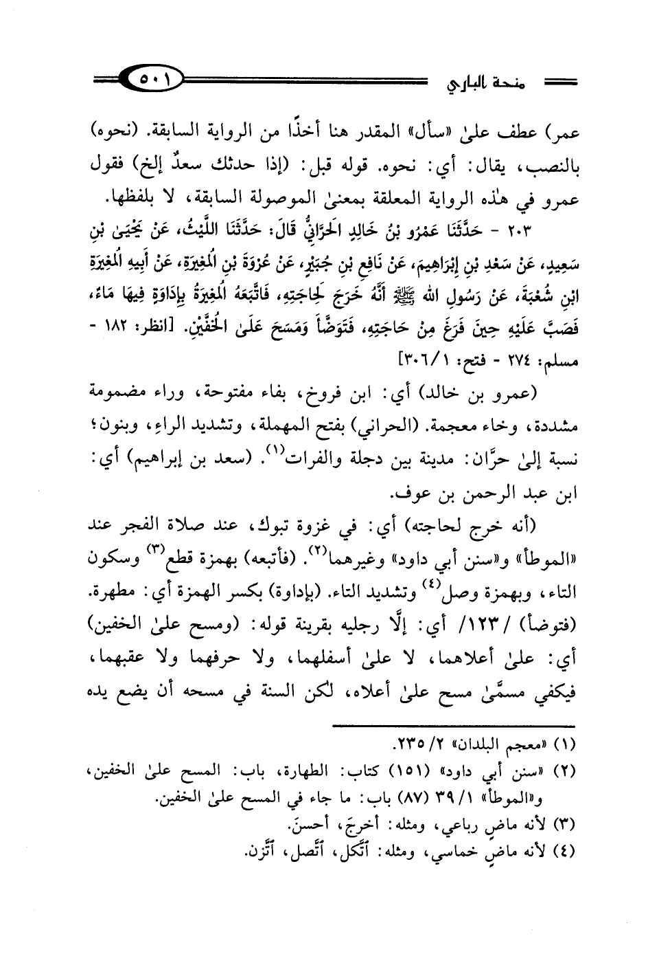203 - حَدَّثَنَا عَمْرُو بْنُ خَالِدٍ الحَرَّانِيُّ، قَالَ: حَدَّثَنَا اللَّيْثُ، عَنْ يَحْيَى بْنِ سَعِيدٍ، عَنْ سَعْدِ بْنِ إِبْرَاهِيمَ، عَنْ نَافِعِ بْنِ جُبَيْرٍ، عَنْ عُرْوَةَ بْنِ المُغِيرَةِ، عَنْ أَبِيهِ المُغِيرَةِ بْنِ شُعْبَةَ، عَنْ رَسُولِ اللَّهِ صَلَّى اللهُ عَلَيْهِ وَسَلَّمَ: "أَنَّهُ خَرَجَ لِحَاجَتِهِ، فَاتَّبَعَهُ المُغِيرَةُ بِإِدَاوَةٍ فِيهَا مَاءٌ، فَصَبَّ عَلَيْهِ حِينَ فَرَغَ مِنْ حَاجَتِهِ فَتَوَضَّأَ وَمَسَحَ عَلَى الخُفَّيْنِ".