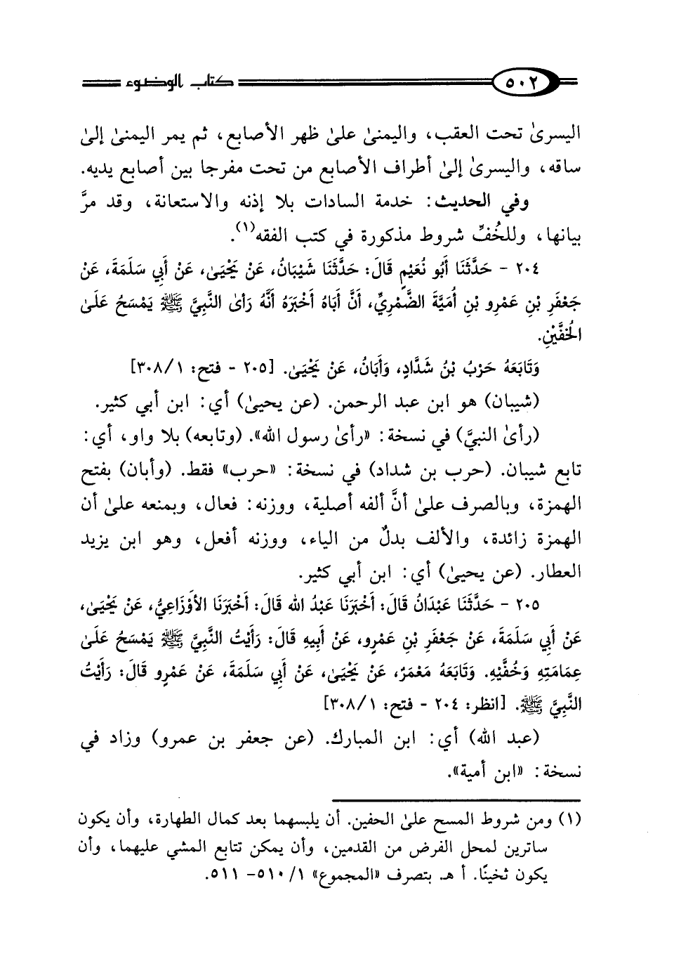 204 - حَدَّثَنَا أَبُو نُعَيْمٍ، قَالَ: حَدَّثَنَا شَيْبَانُ، عَنْ يَحْيَى، عَنْ أَبِي سَلَمَةَ، عَنْ جَعْفَرِ بْنِ عَمْرِو بْنِ أُمَيَّةَ الضَّمْرِيِّ، أَنَّ أَبَاهُ، أَخْبَرَهُ أَنَّهُ "رَأَى النَّبِيَّ صَلَّى اللهُ عَلَيْهِ وَسَلَّمَ يَمْسَحُ عَلَى الخُفَّيْنِ" وَتَابَعَهُ حَرْبُ بْنُ شَدَّادٍ، وَأَبَانُ، عَنْ يَحْيَى.