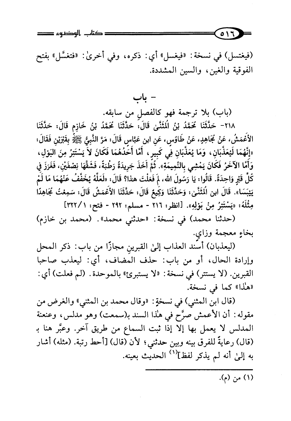 218 - حَدَّثَنَا مُحَمَّدُ بْنُ المُثَنَّى، قَالَ: حَدَّثَنَا مُحَمَّدُ بْنُ خَازِمٍ، قَالَ: حَدَّثَنَا الأَعْمَشُ، عَنْ مُجَاهِدٍ، عَنْ طَاوُسٍ، عَنِ ابْنِ عَبَّاسٍ قَالَ: مَرَّ النَّبِيُّ صَلَّى اللهُ عَلَيْهِ وَسَلَّمَ بِقَبْرَيْنِ، فَقَالَ: "إِنَّهُمَا لَيُعَذَّبَانِ، وَمَا يُعَذَّبَانِ فِي كَبِيرٍ، أَمَّا أَحَدُهُمَا فَكَانَ لَا يَسْتَتِرُ مِنَ البَوْلِ، وَأَمَّا الآخَرُ فَكَانَ يَمْشِي بِالنَّمِيمَةِ" ثُمَّ أَخَذَ جَرِيدَةً رَطْبَةً، فَشَقَّهَا نِصْفَيْنِ، فَغَرَزَ فِي كُلِّ قَبْرٍ وَاحِدَةً، قَالُوا: يَا رَسُولَ اللَّهِ، لِمَ فَعَلْتَ هَذَا؟ قَالَ: "لَعَلَّهُ يُخَفِّفُ عَنْهُمَا مَا لَمْ يَيْبَسَا" وَقَالَ مُحَمَّدُ بْنُ المُثَنَّى، وَحَدَّثَنَا وَكِيعٌ، قَالَ: حَدَّثَنَا الأَعْمَشُ، قَالَ: سَمِعْتُ مُجَاهِدًا مِثْلَهُ: "يَسْتَتِرُ مِنْ بَوْلِهِ".