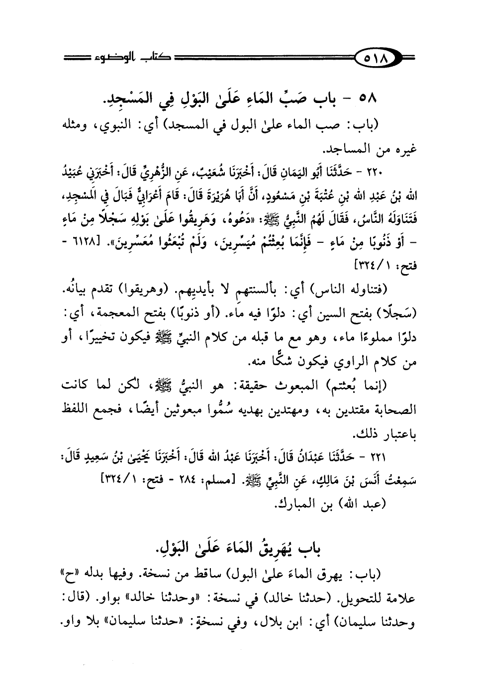 (باب: يهرق الماءَ على البول) ساقط من نسخة. وفيها بدله "ح" علامة للتحويل. (حدثنا خالد) في نسخة: "وحدثنا خالد" بواو. (قال: وحدثنا سليمان) أي: ابن بلال، وفي نسخةٍ: "حدثنا سليمان" بلا واو.