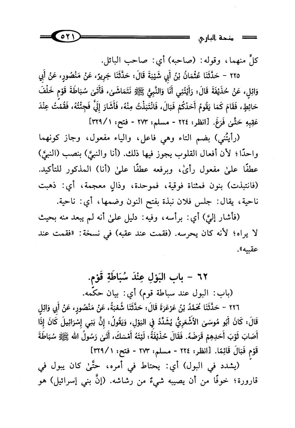 226 - حَدَّثَنَا مُحَمَّدُ بْنُ عَرْعَرَةَ، قَالَ: حَدَّثَنَا شُعْبَةُ، عَنْ مَنْصُورٍ، عَنْ أَبِي وَائِلٍ، قَالَ: كَانَ أَبُو مُوسَى الأَشْعَرِيُّ يُشَدِّدُ فِي البَوْلِ، وَيَقُولُ: "إِنَّ: بَنِي إِسْرَائِيلَ كَانَ إِذَا أَصَابَ ثَوْبَ أَحَدِهِمْ قَرَضَهُ. فَقَالَ: حُذَيْفَةُ لَيْتَهُ أَمْسَكَ "أَتَى رَسُولُ اللَّهِ صَلَّى اللهُ عَلَيْهِ وَسَلَّمَ سُبَاطَةَ قَوْمٍ فَبَالَ قَائِمًا" [انظر: 224 - مسلم: 273 - فتح: 1/ 329]