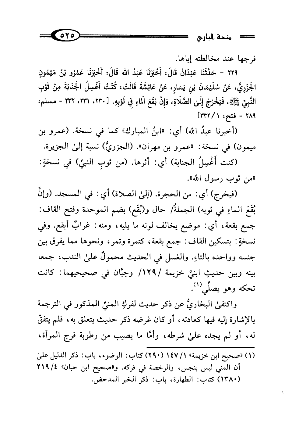 (¬1) "صحيح ابن خزيمة" 1/ 147 (290) كتاب: الوضوء، باب: ذكر الدليل على أن المني ليس بنجس، والرخصة في فركه. و"صحيح ابن حبان" 4/ 219 (1380) كتاب: الطهارة، باب: ذكر الخبر المدحض.