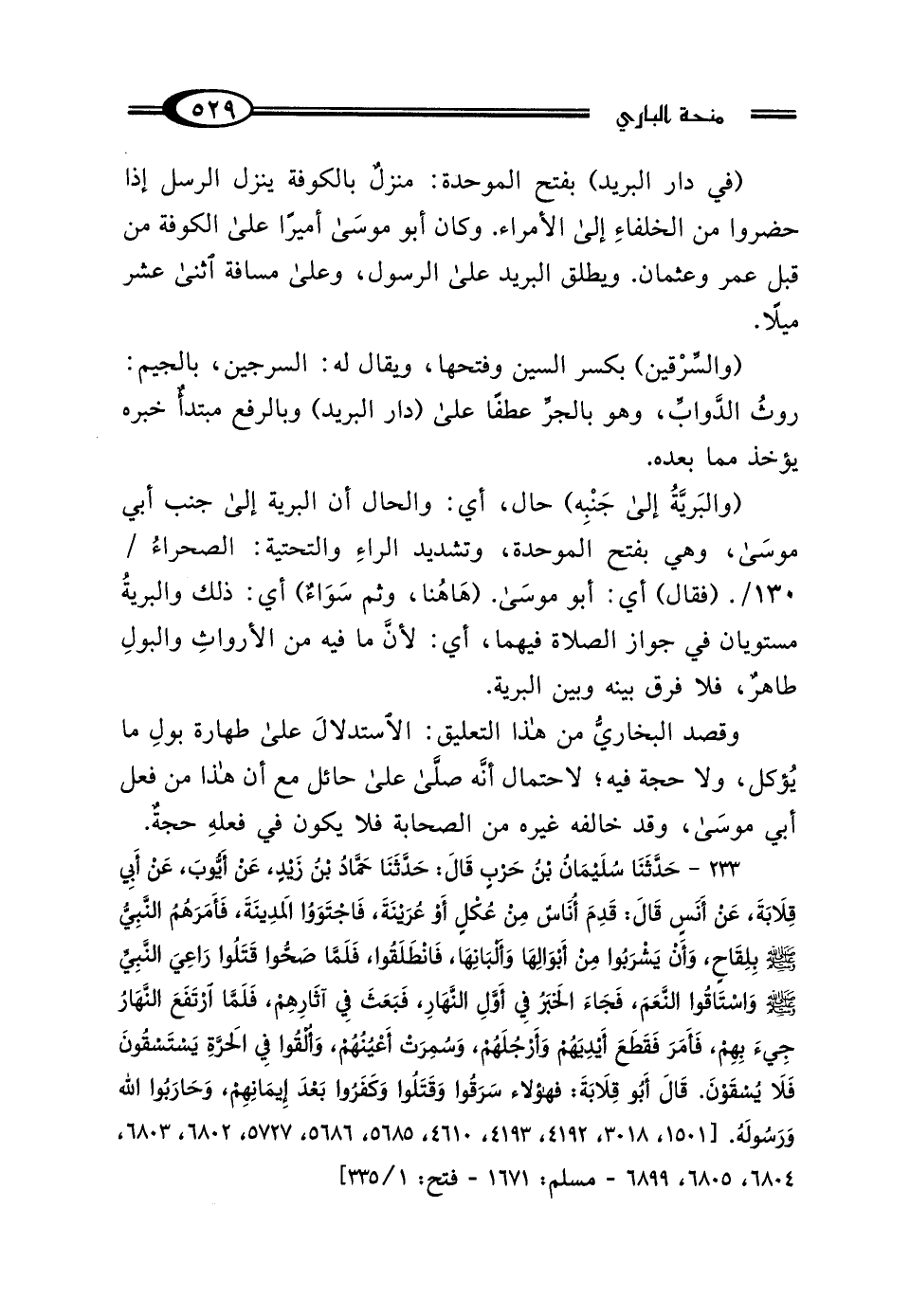 (والبَريَّةُ إلى جَنْبِه) حال، أي: والحال أن البرية إلى جنب أبي موسَى، وهي بفتح الموحدة، وتشديد الراءِ والتحتية: الصحراءُ. (فقال) أي: أبو موسَى. (هَاهُنا، وثم سَوَاءٌ) أي: ذلك والبريةُ مستويان في جواز الصلاة فيهما، أي: لأنَّ ما فيه من الأرواثِ والبولِ طاهرٌ، فلا فرق بينه وبين البرية.