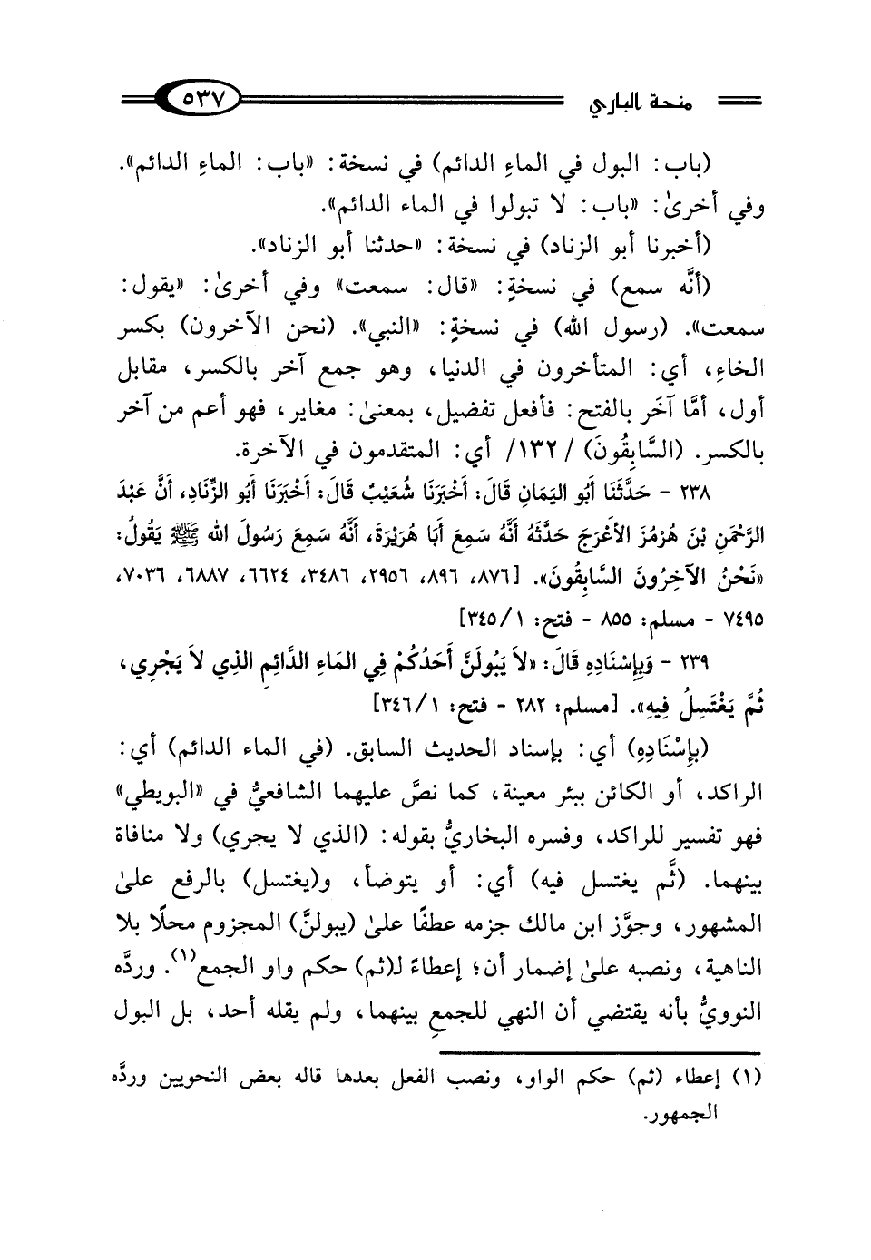 (باب: البول في الماءِ الدائم) في نسخة: "باب: الماءِ الدائم".