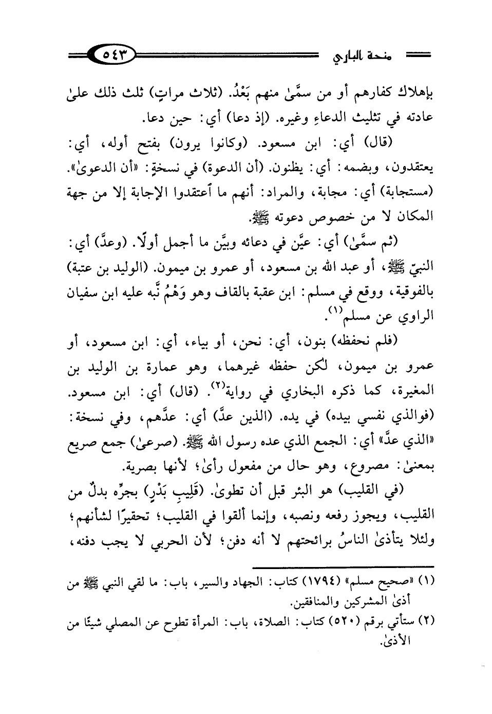 (فلم نحفظه) بنون، أي: نحن، أو بياء، أي: ابن مسعود، أو عمرو بن ميمون، لكن حفظه غيرهما، وهو عمارة بن الوليد بن المغيرة، كما ذكره البخاري في رواية (¬2). (قال) أي: ابن مسعود. (فوالذي نفسي بيده) في يده. (الذين عدَّ) أي: عدَّهم، وفي نسخة: "الذي عدَّ" أي: الجمع الذي عده رسول الله - صلى الله عليه وسلم -. (صرعى) جمع صريع بمعنا: مصروع، وهو حال من مفعول رأى؛ لأنها بصرية.