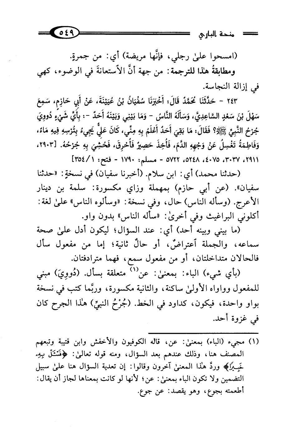 243 - حَدَّثَنَا مُحَمَّدٌ يَعْنِي ابْنَ سَلامٍ، قَالَ: أَخْبَرَنَا سُفْيَانُ بْنُ عُيَيْنَةَ، عَنْ أَبِي حَازِمٍ، سَمِعَ سَهْلَ بْنَ سَعْدٍ السَّاعِدِيَّ، وَسَأَلَهُ النَّاسُ، وَمَا بَيْنِي وَبَيْنَهُ أَحَدٌ: بِأَيِّ شَيْءٍ دُوويَ جُرْحُ النَّبِيِّ صَلَّى اللهُ عَلَيْهِ وَسَلَّمَ؟ فَقَالَ: مَا بَقِيَ أَحَدٌ أَعْلَمُ بِهِ مِنِّي، "كَانَ عَلِيٌّ يَجِيءُ بِتُرْسِهِ فِيهِ مَاءٌ، وَفَاطِمَةُ تَغْسِلُ عَنْ وَجْهِهِ الدَّمَ، فَأُخِذَ حَصِيرٌ فَأُحْرِقَ، فَحُشِيَ بِهِ جُرْحُهُ".