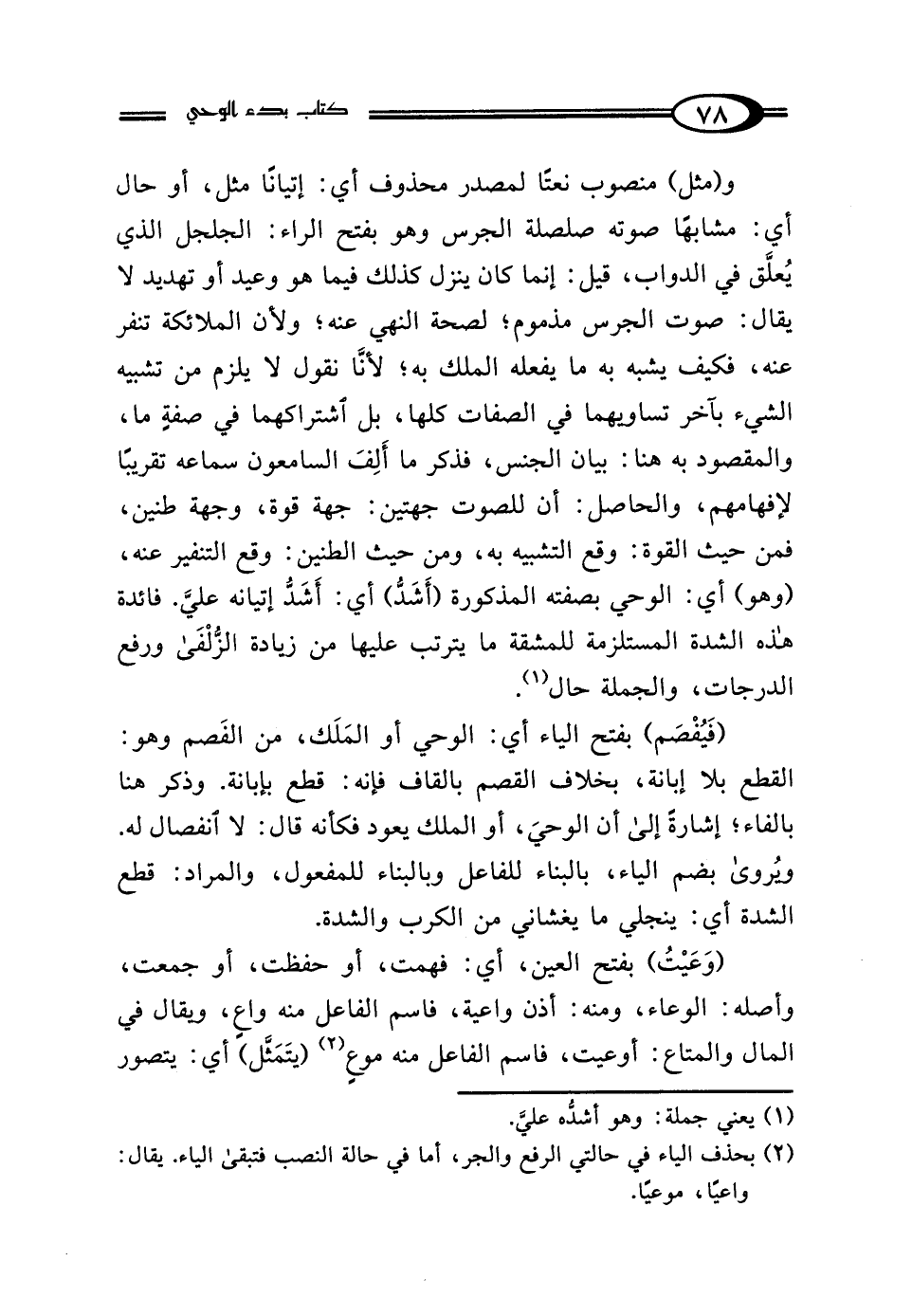 و (مثل) منصوب نعتًا لمصدر محذوف أي: إتيانًا مثل، أو حال أي: مشابهًا صوته صلصلة الجرس وهو بفتح الراء: الجلجل الذي يُعلَّق في الدواب، قيل: إنما كان ينزل كذلك فيما هو وعيد أو تهديد لا يقال: صوت الجرس مذموم؛ لصحة النهي عنه؛ ولأن الملائكة تنفر عنه، فكيف يشبه به ما يفعله الملك به؛ لأنَّا نقول لا يلزم من تشبيه الشيء بآخر تساويهما في الصفات كلها، بل اشتراكهما في صفةٍ ما، والمقصود به هنا: بيان الجنس، فذكر ما أَلِفَ السامعون سماعه تقريبًا لإفهامهم، والحاصل: أن للصوت جهتين: جهة قوة، وجهة طنين، فمن حيث القوة: وقع التشبيه به، ومن حيث الطنين: وقع التنفير عنه، (وهو) أي: الوحي بصفته المذكورة (أَشَدُّ) أي: أَشَدُّ إتيانه عليَّ. فائدة هذه الشدة المستلزمة للمشقة ما يترتب عليها من زيادة الزُّلْفَى ورفع الدرجات، والجملة حال (¬1).
