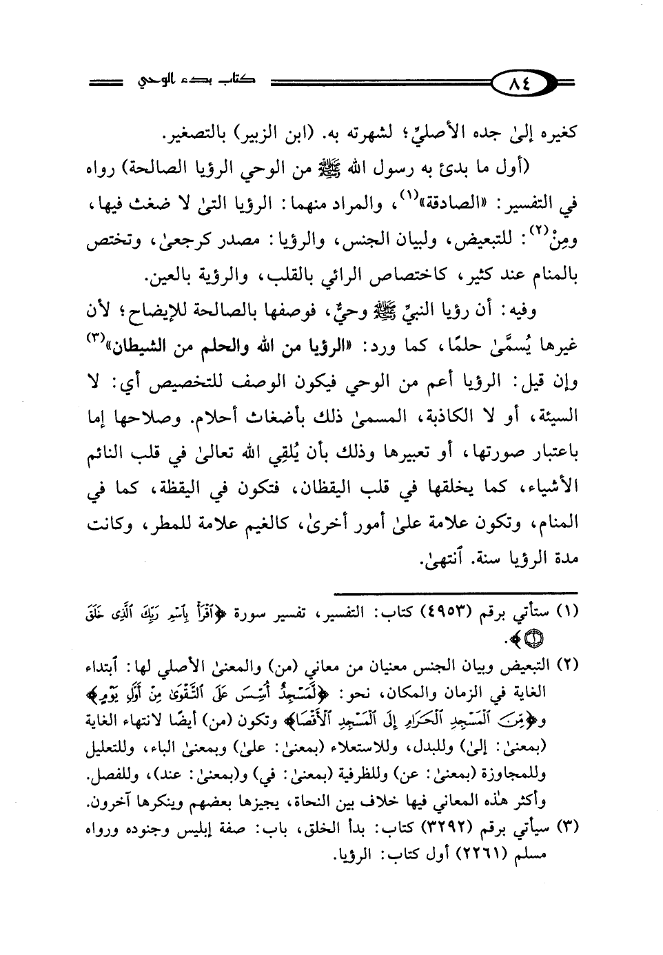 (أول ما بدئ به رسول الله - صلى الله عليه وسلم - من الوحي الرؤيا الصالحة) رواه في التفسير: "الصادقة" (¬1)، والمراد منهما: الرؤيا التي لا ضغث فيها، ومِنْ (¬2): للتبعيض، ولبيان الجنس، والرؤيا: مصدر كرجعى، وتختص بالمنام عند كثير، كاختصاص الرائي بالقلب، والرؤية بالعين.