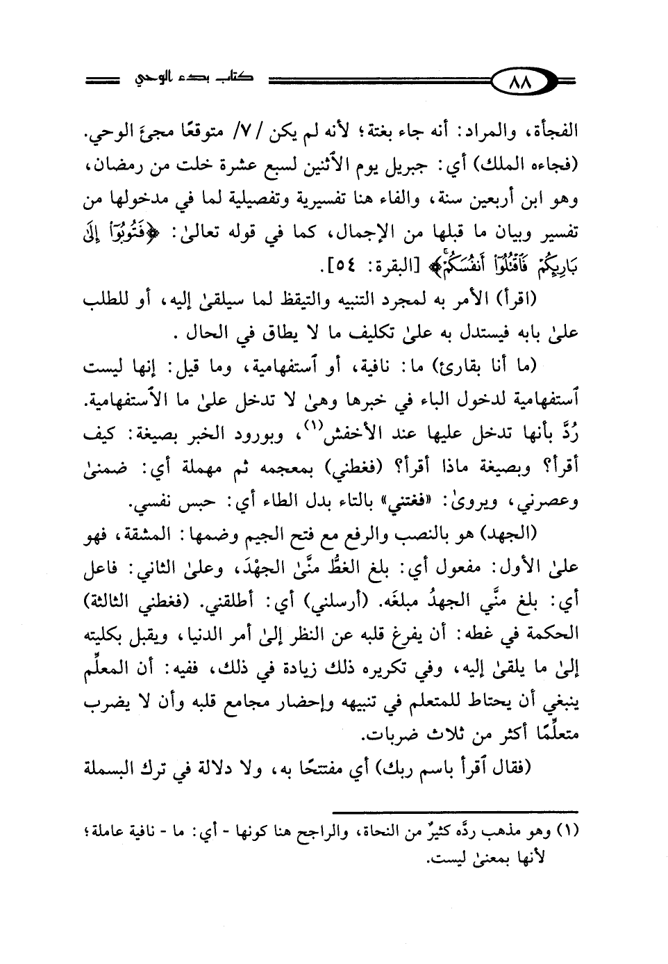(ما أنا بقارئ) ما: نافية، أو استفهامية، وما قيل: إنها ليست استفهامية لدخول الباء في خبرها وهي لا تدخل على ما الاستفهامية. رُدَّ بأنها تدخل عليها عند الأخفش (¬1)، وبورود الخبر بصيغة: كيف أقرأ؟ وبصيغة ماذا أقرأ؟ (فغطني) بمعجمه ثم مهملة أي: ضمني وعصرني، ويروى: "فغتني" بالتاء بدل الطاء أي: حبس نفسي.