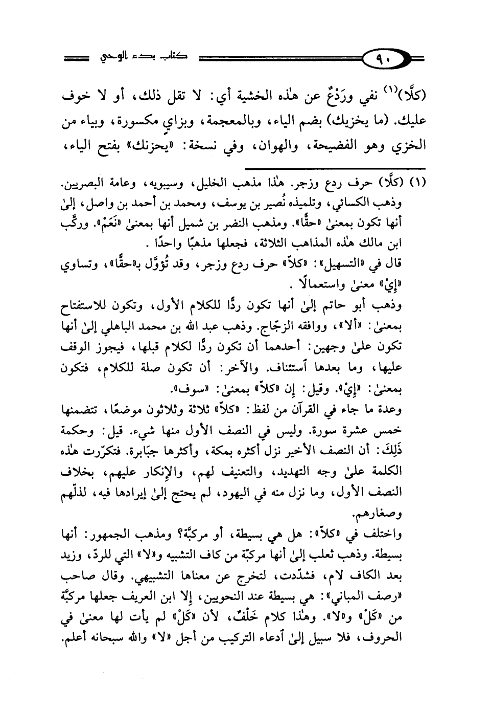(¬1) (كلَّا) حرف ردع وزجر. هذا مذهب الخليل، وسيبويه، وعامة البصريين. وذهب الكسائي، وتلميذه نُصير بن يوسف، ومحمد بن أحمد بن واصل، إلى أنها تكون بمعنى "حقًّا". ومذهب النضر بن شميل أنها بمعنى "نَعَمْ". وركب ابن مالك هذه المذاهب الثلاثة، فجعلها مذهبًا واحدًا.