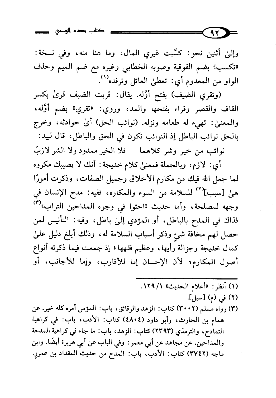 (¬3) رواه مسلم (3002) كتاب: الزهد والرقائق، باب: المؤمن أمره كله خير. عن همام بن الحارث، وأبو داود (4804) كتاب: الأدب، باب: في كراهية التمادح، والترمذي (2393) كتاب: الزهد، باب: ما جاء في كراهية المدحة والمداحين. عن مجاهد عن أبي معمر: وفي الباب عن أبي هريرة أيضًا. وابن ماجه (3742) كتاب: الأدب، باب: المدح من حديث المقداد بن عمرو.