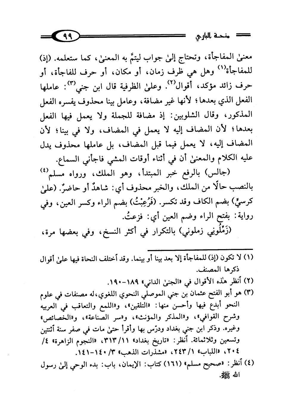 (¬1) لا تكون (إذ) للمفاجأة إلا بعد بينا أو بينما. وقد اختلف النحاة فيها على أقوال ذكرها المصنف.