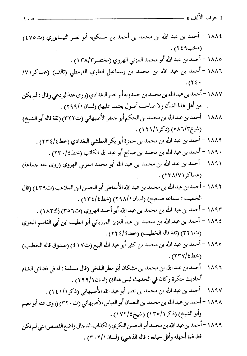 1887 - أحمد بن عبد الله بن محمد بن حمدويه أبو نصر البغدادي (روى عنه البردعي وقال: لم يكن من أهل هذا الشأن ولا صاحب أصول يعتمد عليها) (لسان 1/ 299).