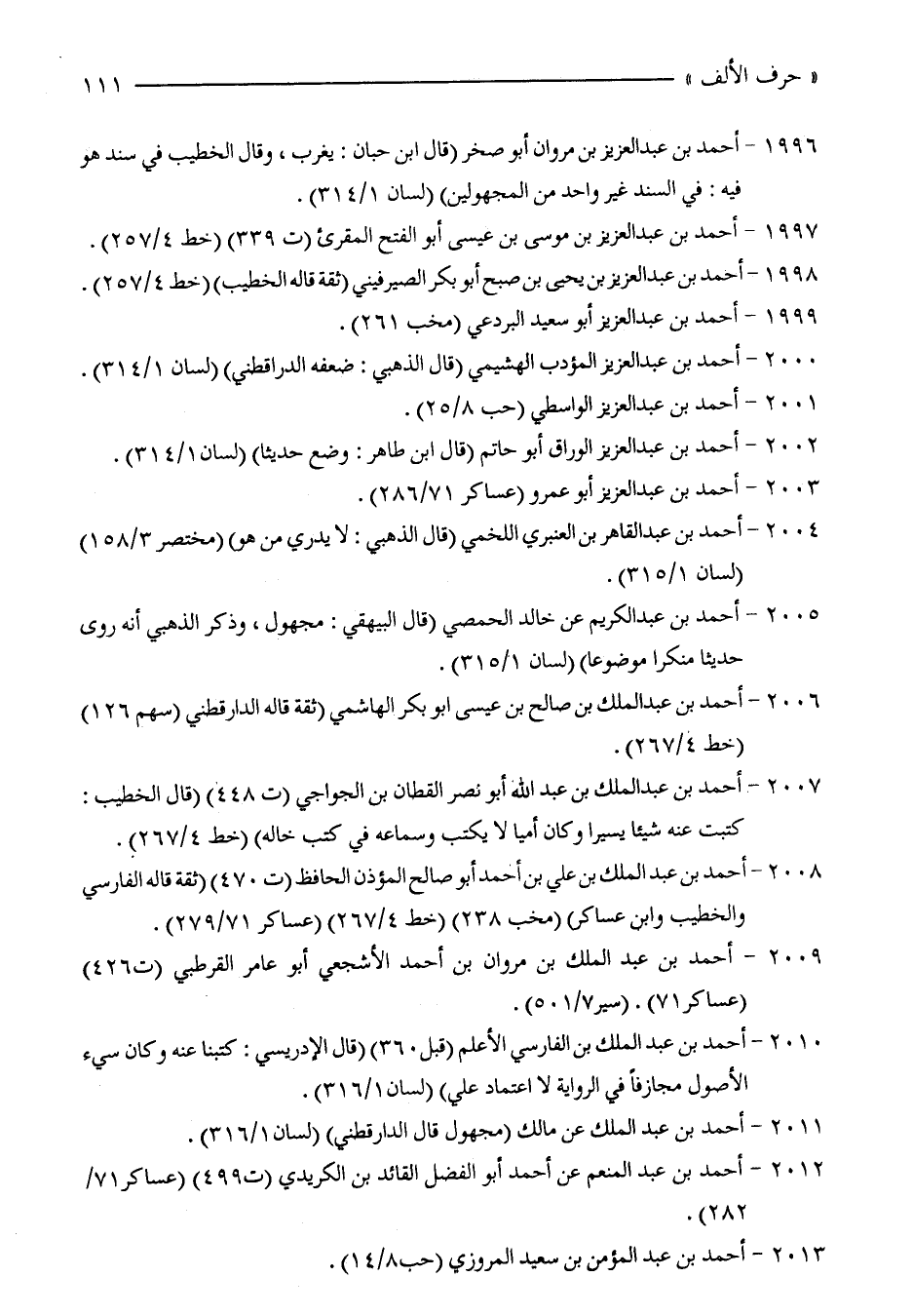 1996 - أحمد بن عبد العزيز بن مروان أبو صخر (قال ابن حبان: يغرب، وقال الخطيب في سند هو فيه: في السند غير واحد من المجهولين (لسان 1/ 314).