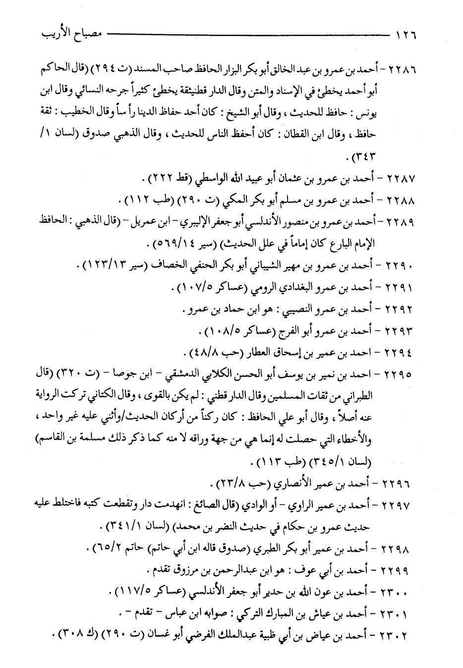 2297 - أحمد بن عمير الراوي- أو الوادي (قال الصائغ: انهدمت دار وتقطعت كتبه فاختلط عليه حديث عمرو بن حكام في حديث النضر بن محمد) (لسان 1/ 341).