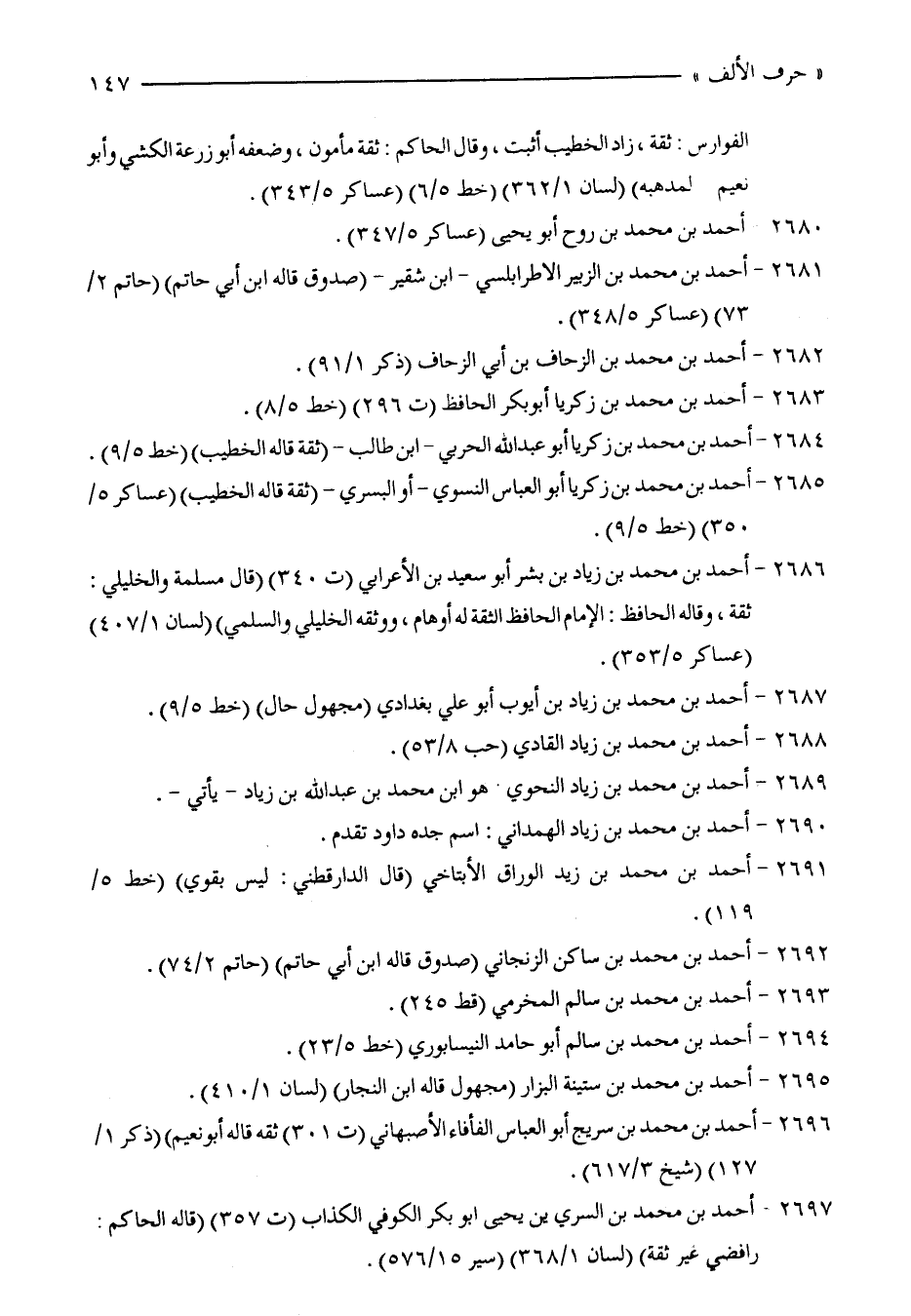 2686 - أحمد بن محمد بن زياد بن بشر أبو سعيد بن الأعرابي (ت 340) (قال مسلمة والخليلي: ثقة، وقاله الحافظ: الإمام الحافظ الثقة له أوهام، ووثقه الخليلي والسلمي) (لسان 1/ 407) (عساكر 5/ 353).