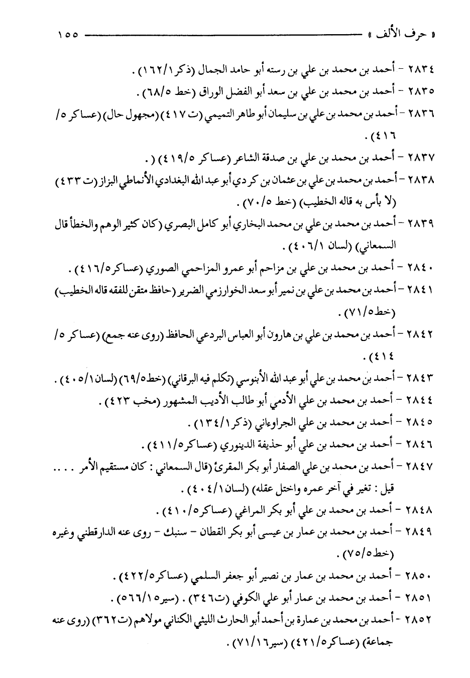 2841 - أحمد بن محمَّد بن علي بن نمير أبو سعد الخوارزمي الضرير (حافظ متقن للفقه قاله الخطيب) (خط 5/ 71).