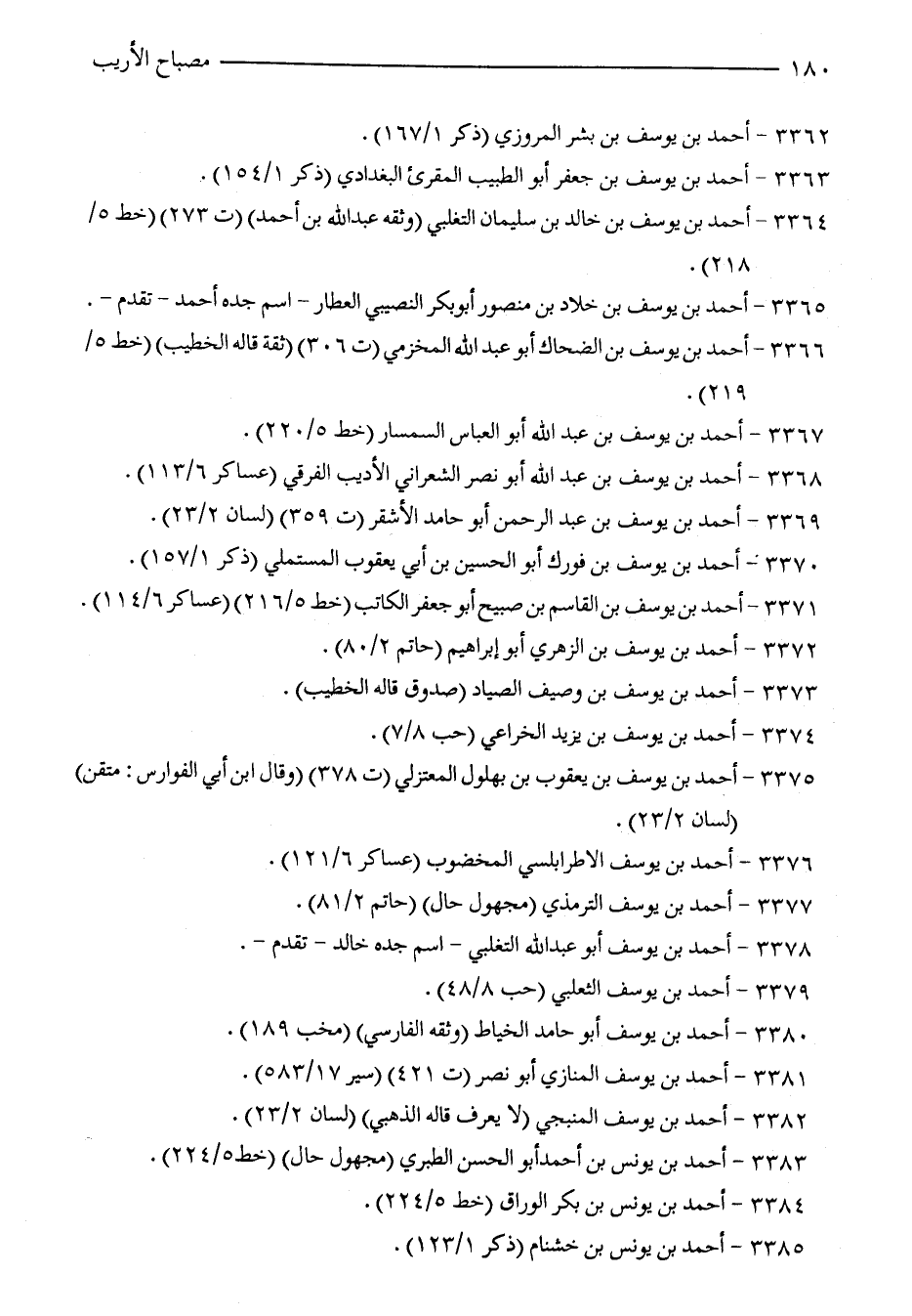 3364 - أحمد بن يوسف بن خالد بن سليمان التغلبي (وثقه عبد الله بن أحمد) (ت 273) (خط 5/ 218).