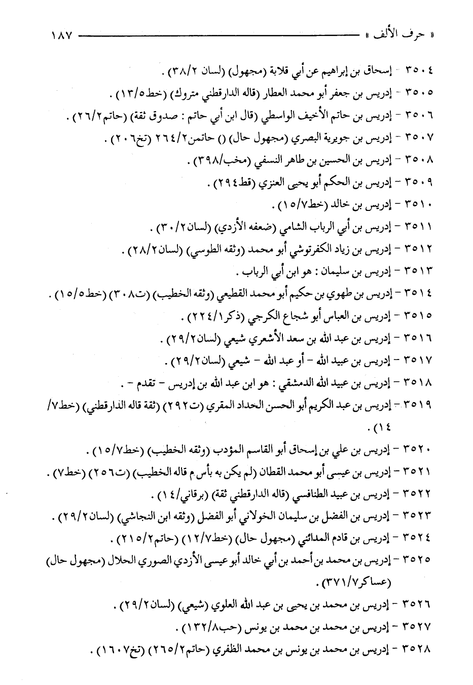 3505 - إدريس بن جعفر أبو محمَّد العطار (قاله الدارقطني متروك) (خط 5/ 13).