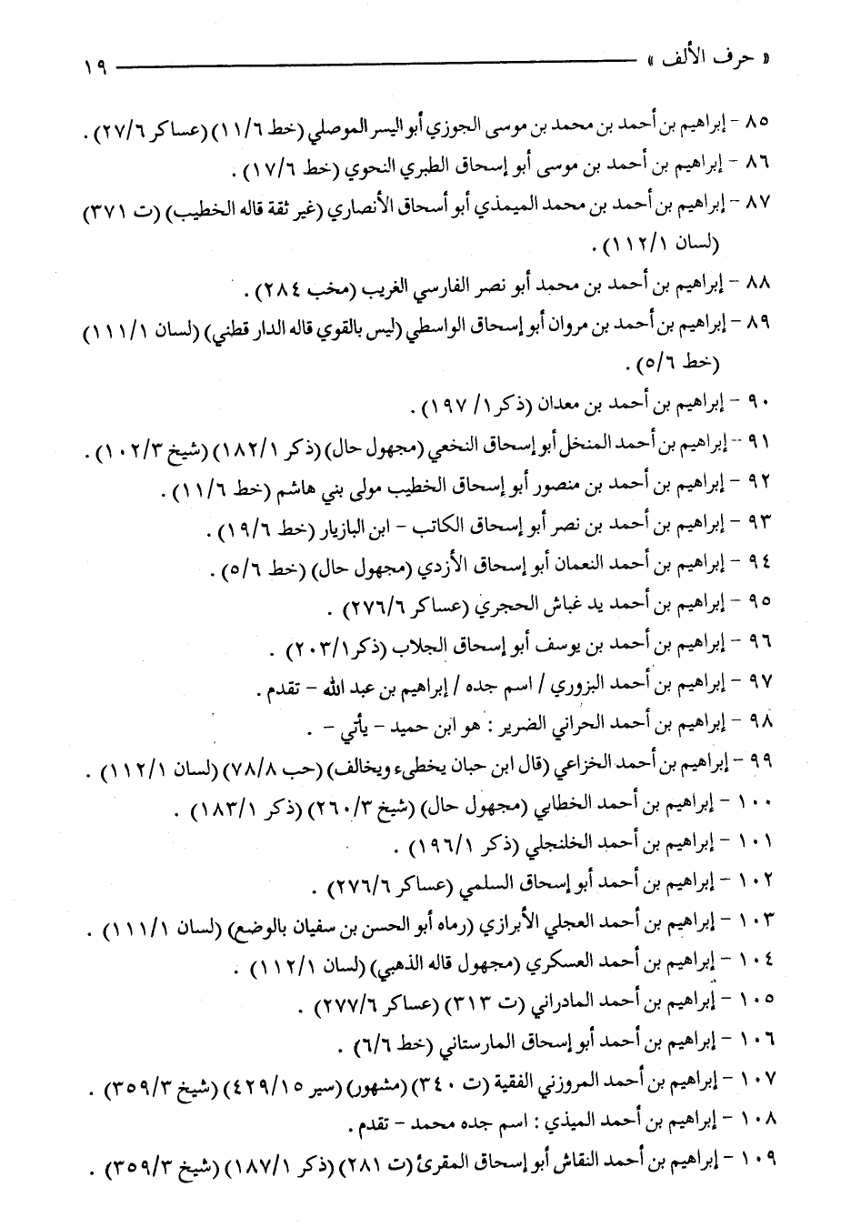 87 - إبراهيم بن أحمد بن محمد الميمذي أبو أسحاق الأنصاري (غير ثقة قاله الخطيب) (ت 371) (لسان 1/ 112).