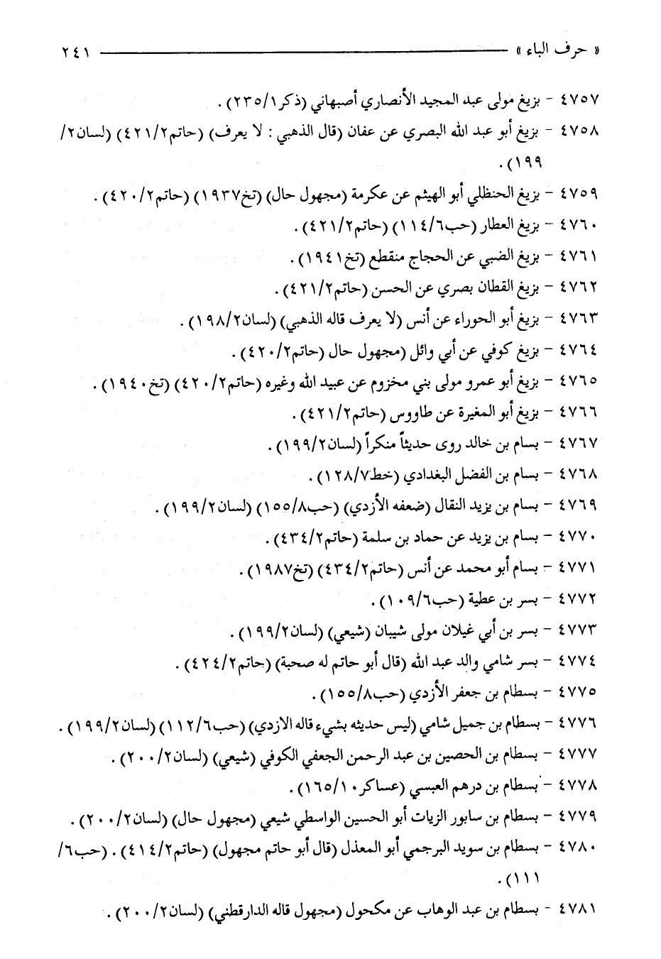 4780 - بسطام بن سويد البرجمي أبو المعذل (قال أبو حاتم مجهول) (حاتم 2/ 414). (حب 6/ 111).
