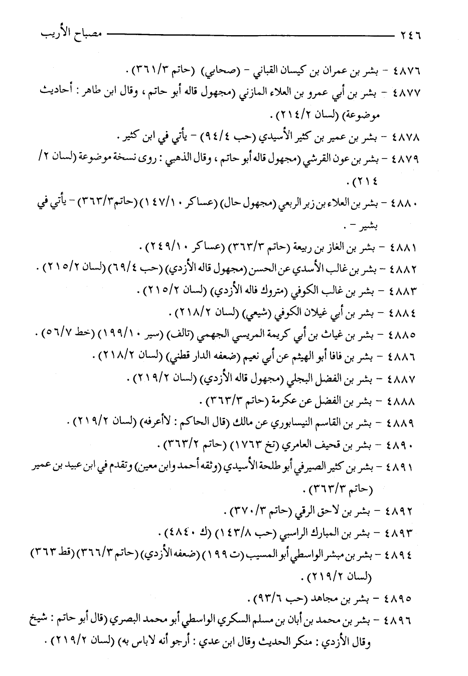4882 - بشر بن غالب الأسدي عن الحسن (مجهول قاله الأزدي) (حب 4/ 69) (لسان 2/ 215).