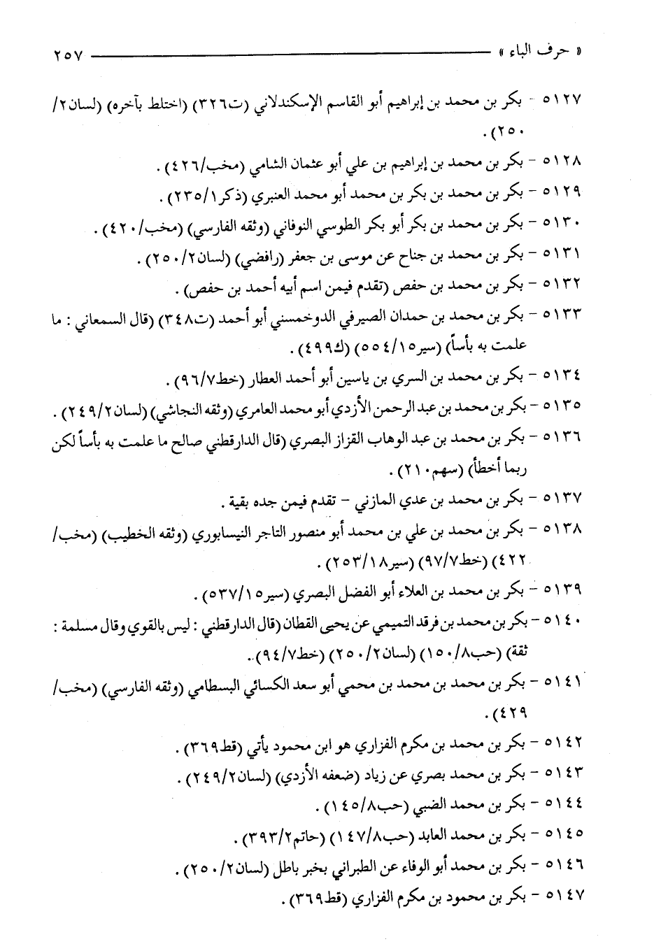 5140 - بكر بن محمَّد بن فرقد التميمي عن يحيى القطان (قال الدارقطني: ليس بالقوي وقال مسلمة: ثقة) (حب 8/ 150) (لسان 2/ 250) (خط 7/ 94).