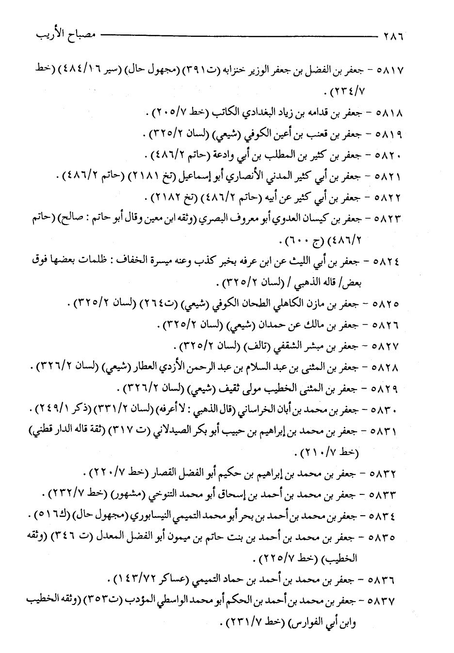 5835 - جعفر بن محمَّد بن أحمد بن بنت حاتم بن ميمون أبو الفضل المعدل (ت 346) (وثقه الخطيب) (خط 7/ 225).
