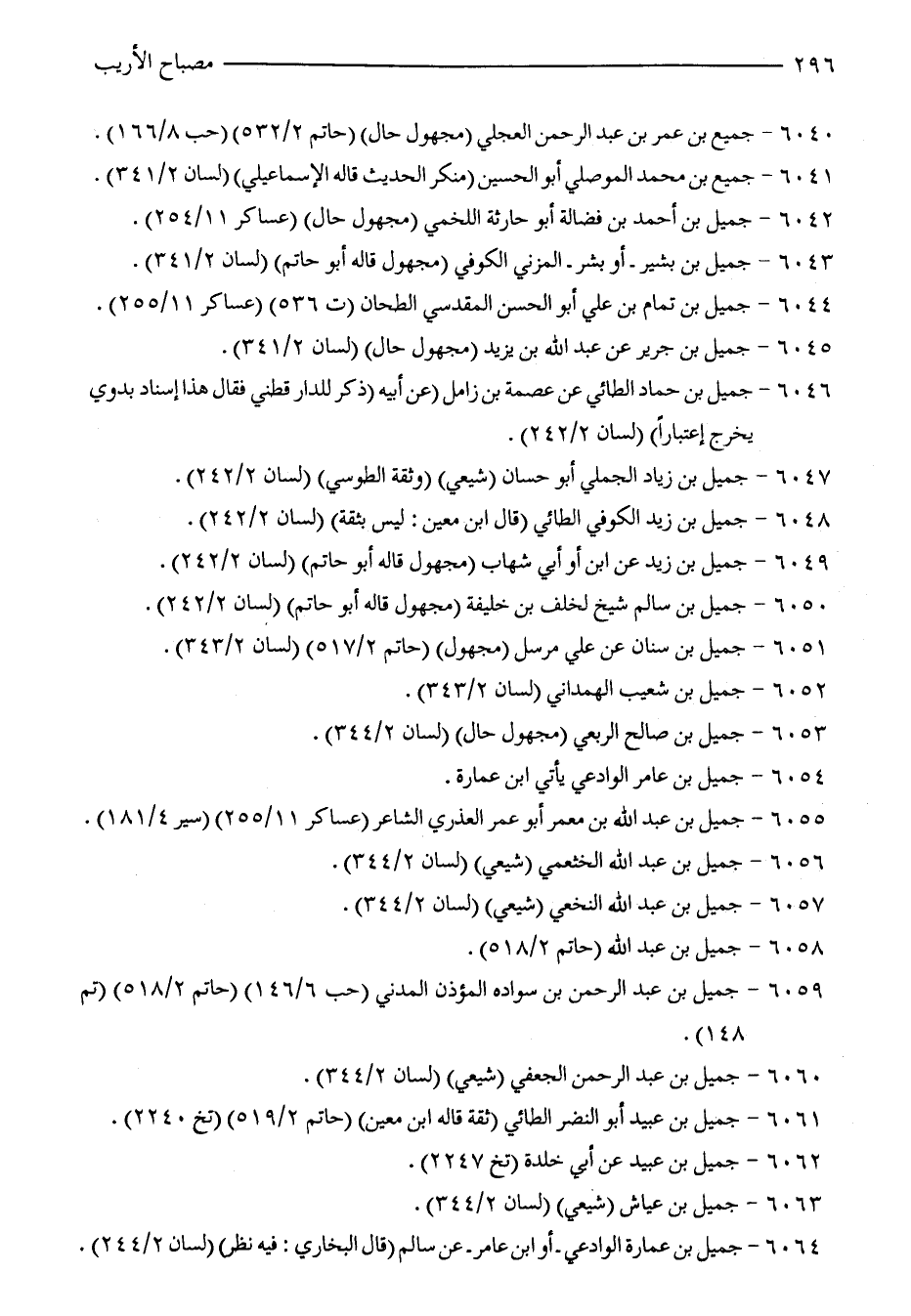 6041 - جميع بن محمَّد الموصلي أبو الحسين (منكر الحديث قاله الإسماعيلي) (لسان 2/ 341).