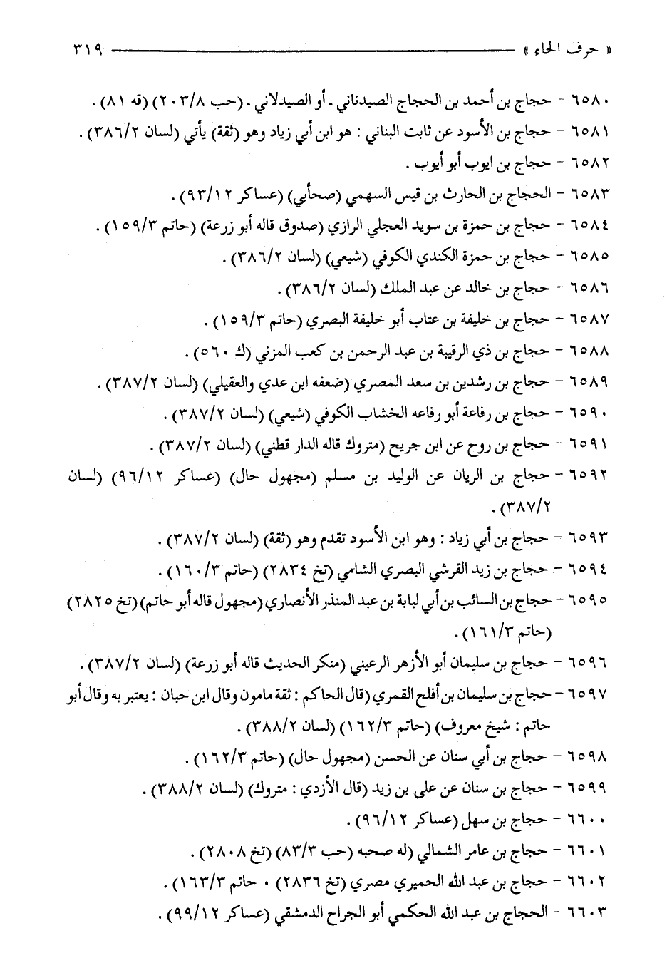 6597 - حجاج بن سليمان بن أفلح القمري (قال الحاكم: ثقة مامون وقال ابن حبان: يعتبر به وقال أبو حاتم: شيخ معروف) (حاتم 3/ 162) (لسان 2/ 388).
