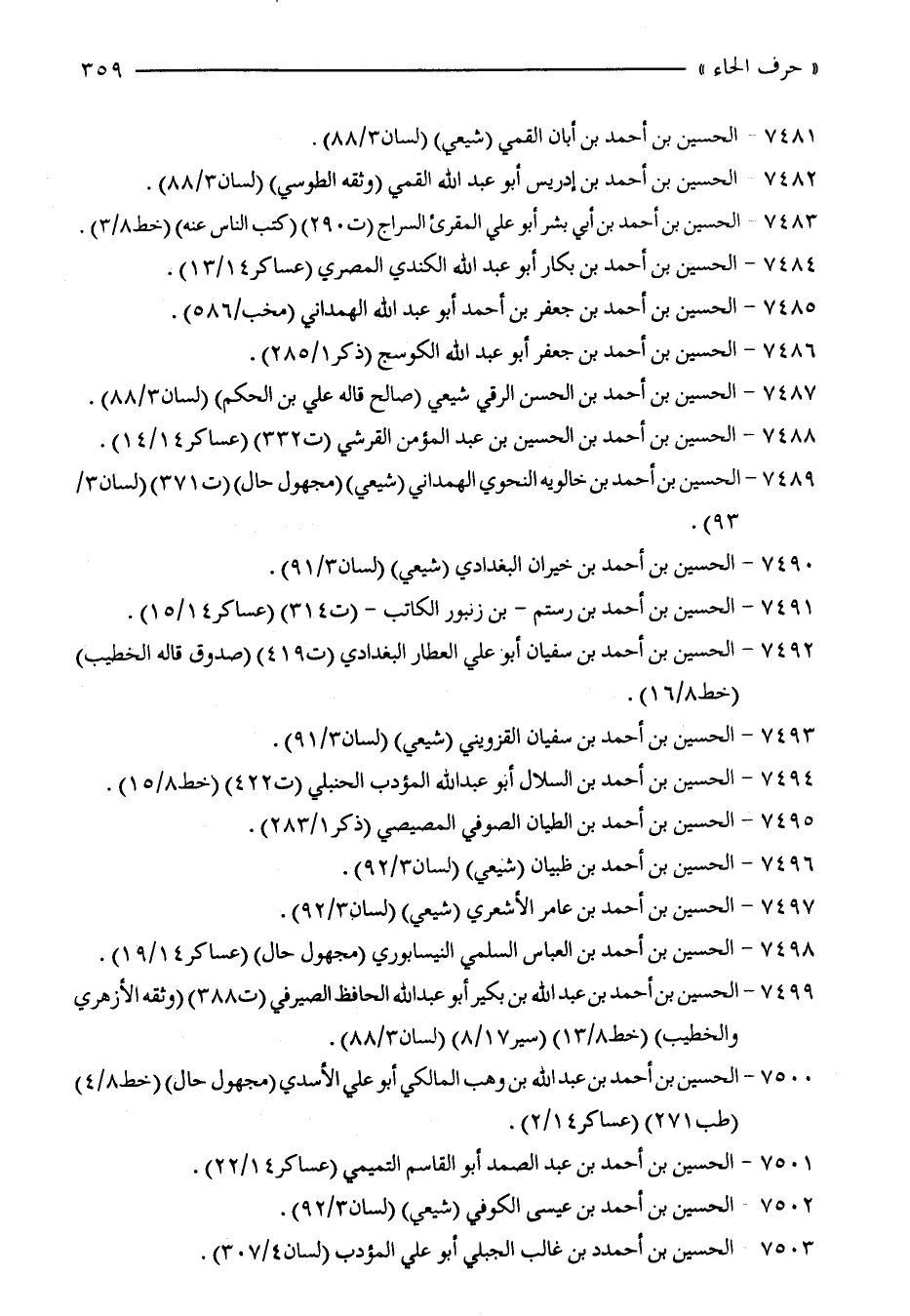 7500 - الحسين بن أحمد بن عبد الله بن وهب المالكي أبو علي الأسدي (مجهول حال) (خط 8/ 4) (طب 271) (عساكر 14/ 2).