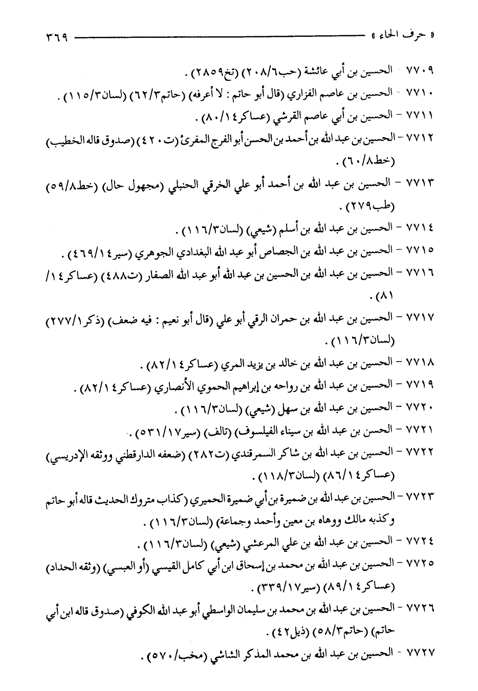 7722 - الحسين بن عبد الله بن شاكر السمرقندي (ت 282) (ضعفه الدارقطني ووثقه الإدريسي) (عساكر 14/ 86) (لسان 3/ 118).