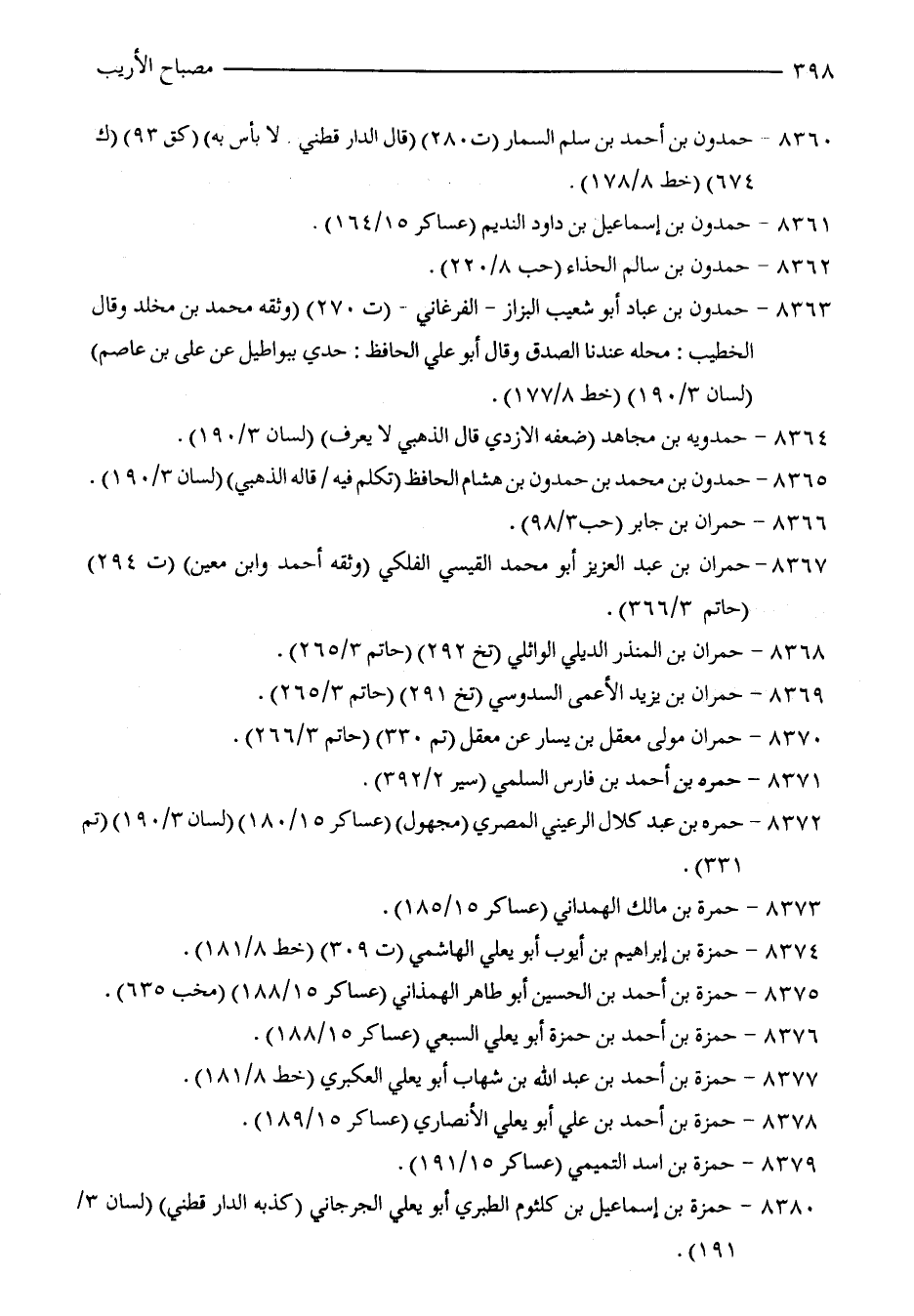 8360 - حمدون بن أحمد بن سلم السمار (ت 280) (قال الدارقطني لا بأس به) (كق 93) (ك 674) (خط 8/ 178).