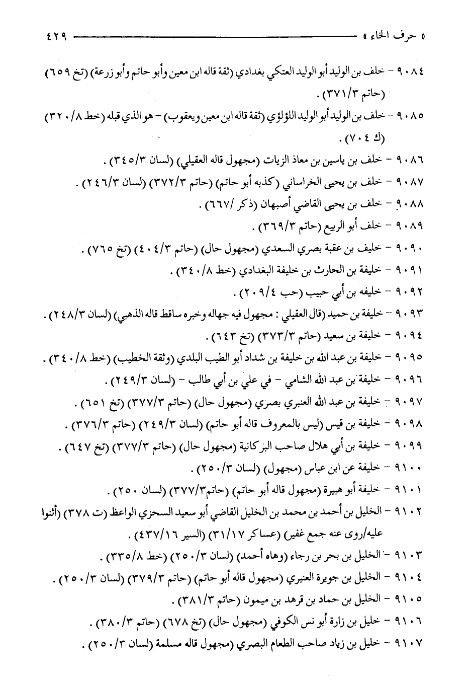 9093 - خليفة بن حميد (قال العقيلي: مجهول فيه جهاله وخبره ساقط قاله الذهبي) (لسان 3/ 248).