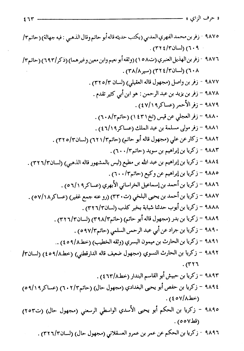 9876 - زفر بن الهذيل العنبري (ت 158) (وثقه أبو نعيم وابن معين وغيرهما) (ذكر/693) (حاتم 3/ 608) (لسان 3/ 324) (سير 8/ 38).