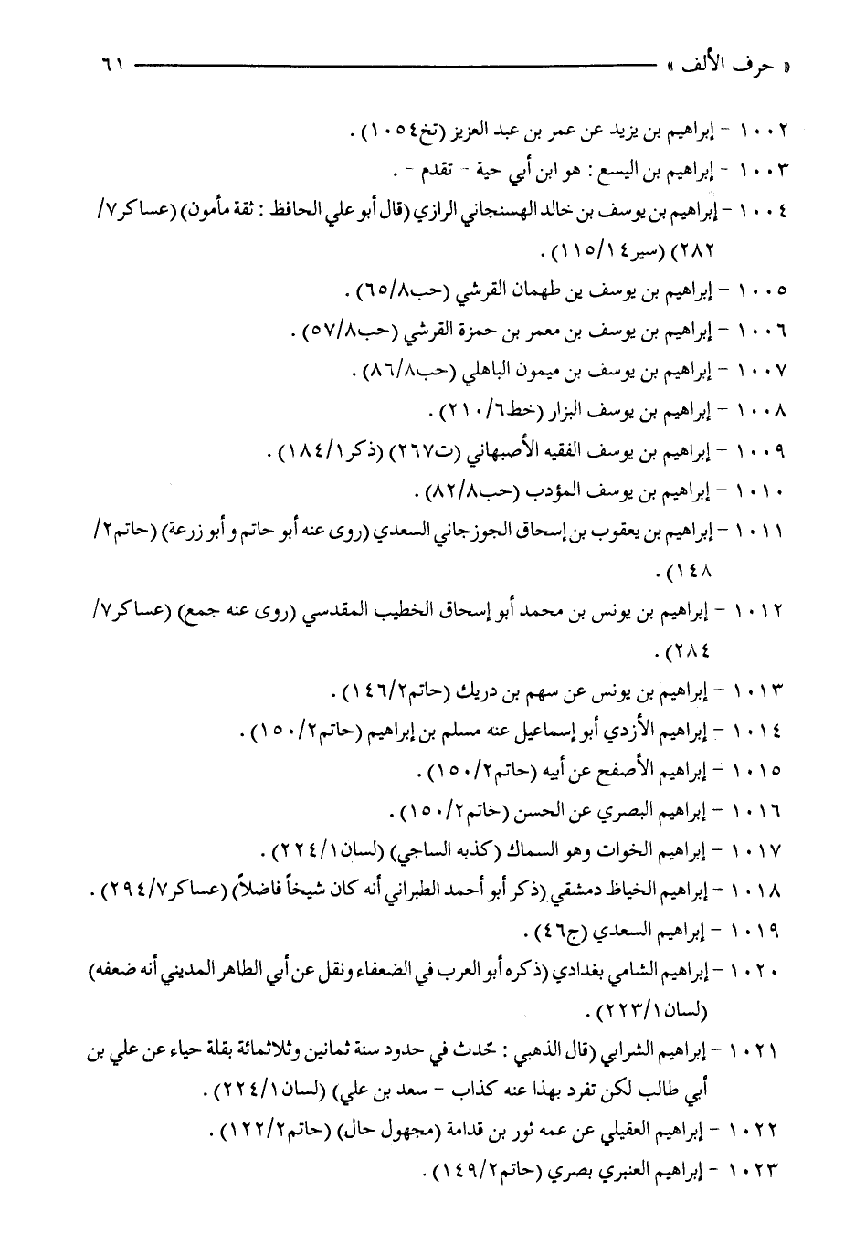 1020 - إبراهيم الشامي بغدادي (ذكره أبو العرب في الضعفاء ونقل عن أبي الطاهر المديني أنه ضعفه) (لسان 1/ 223).